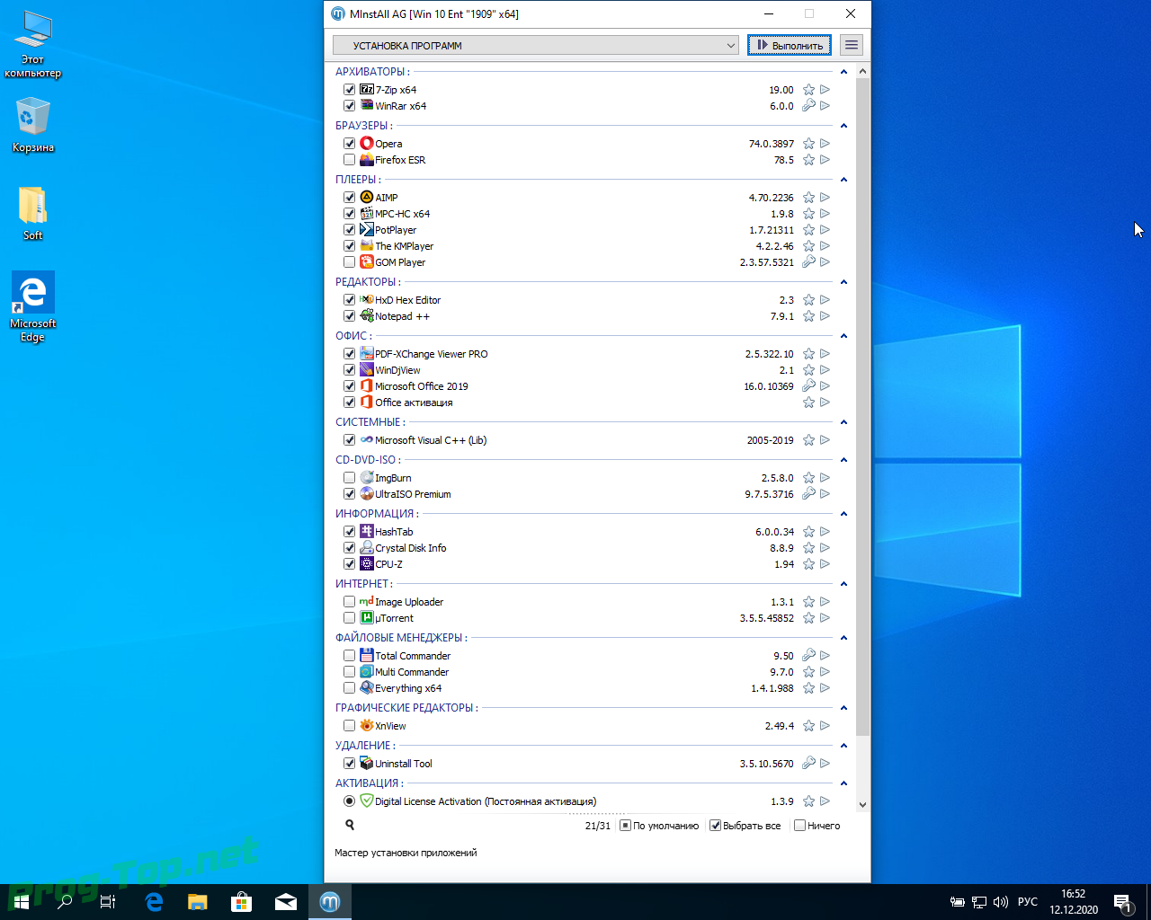 - Для браузеров: Opera v74.0, Firefox ESR v78.5 Плееры: AIMP Player v4.70, KMPlayer v4.2.2.46, MPC-HC Player v1.9.8, PotPlayer v1.7.21311, GomPlayer v2.3.57.5321 Редакторы: Notepad ++ v7.9.1, HxD Hex Editor v2.3 Офисные: PDF XChange Viewer v2.5.322, WinDjView v2.1 Microsoft Office 2019 VL v16.0.10368 (Состав: Word, Excel, PowerPoint, Outlook, Project, Visio, Access и Publisher) Корпоративный канал с долгосрочным обслуживанием.
