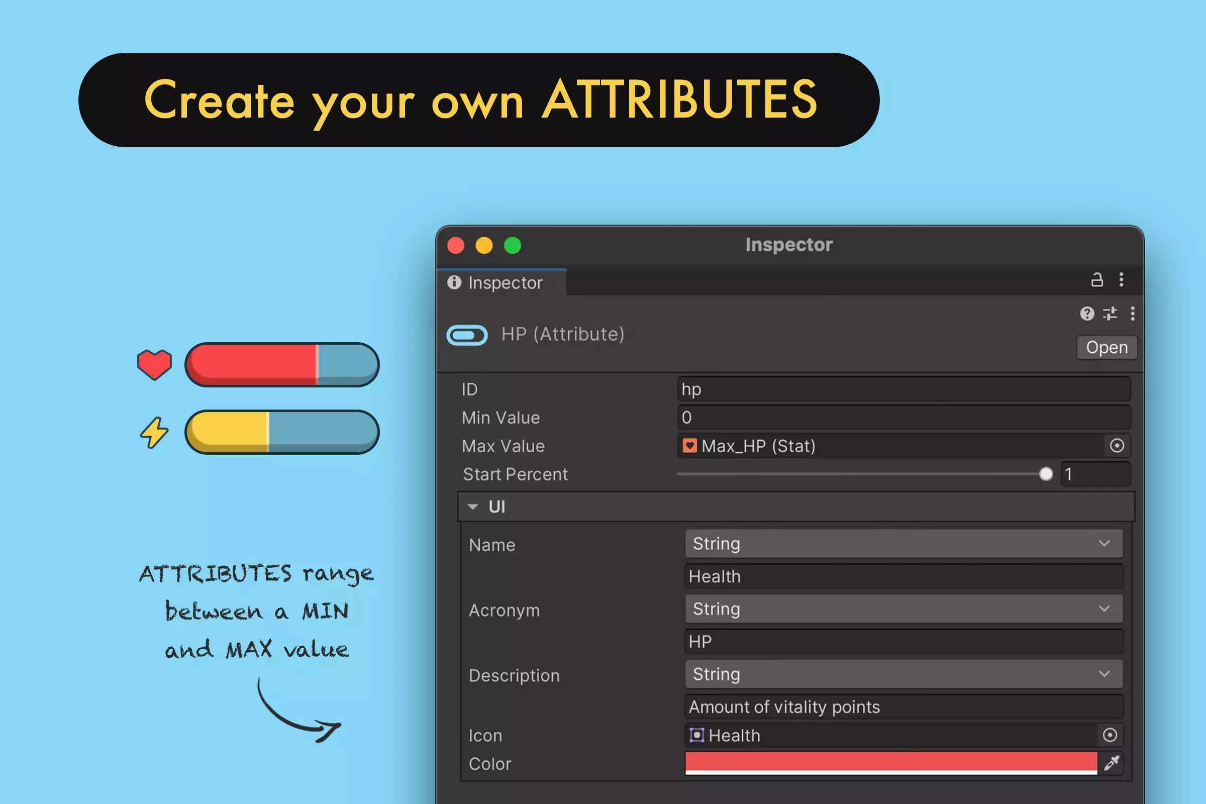 - Атрибуты: Значения, определяемые в определенном диапазоне, например здоровье, мана или выносливость.
