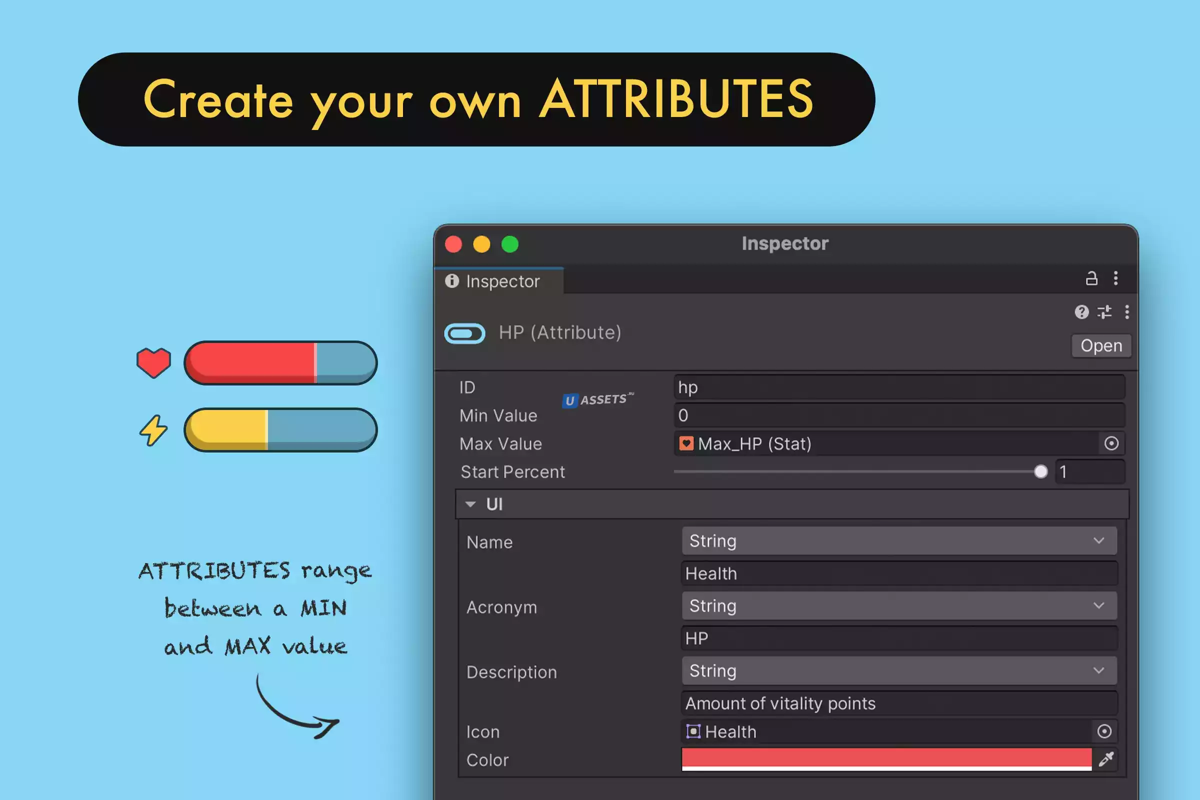 - Атрибуты: значения, определенные в пределах диапазона, такие как здоровье, мана или выносливость.
