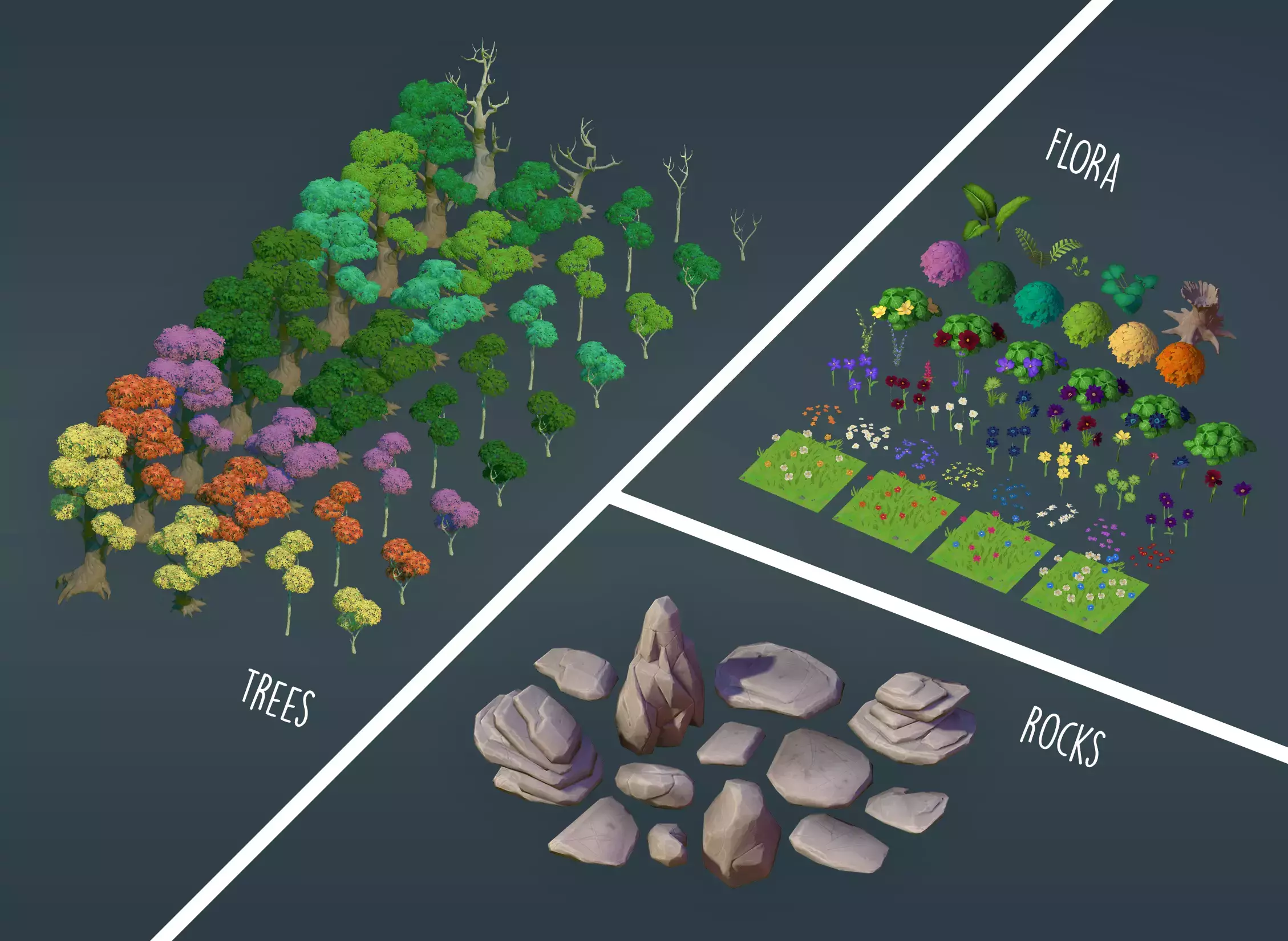✅ Пользовательские шейдеры для деревьев и скал, позволяющие изменять цветовую гамму