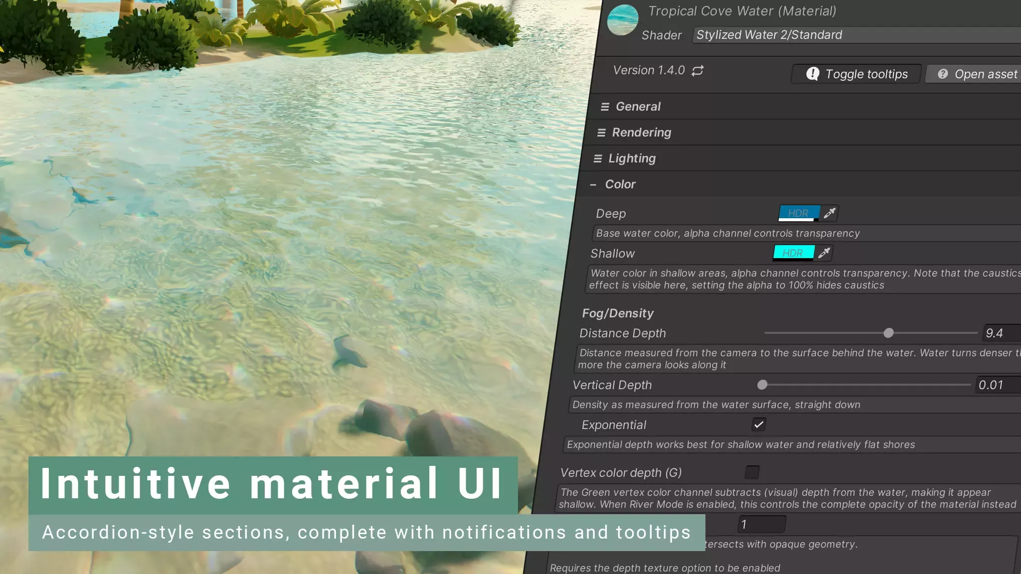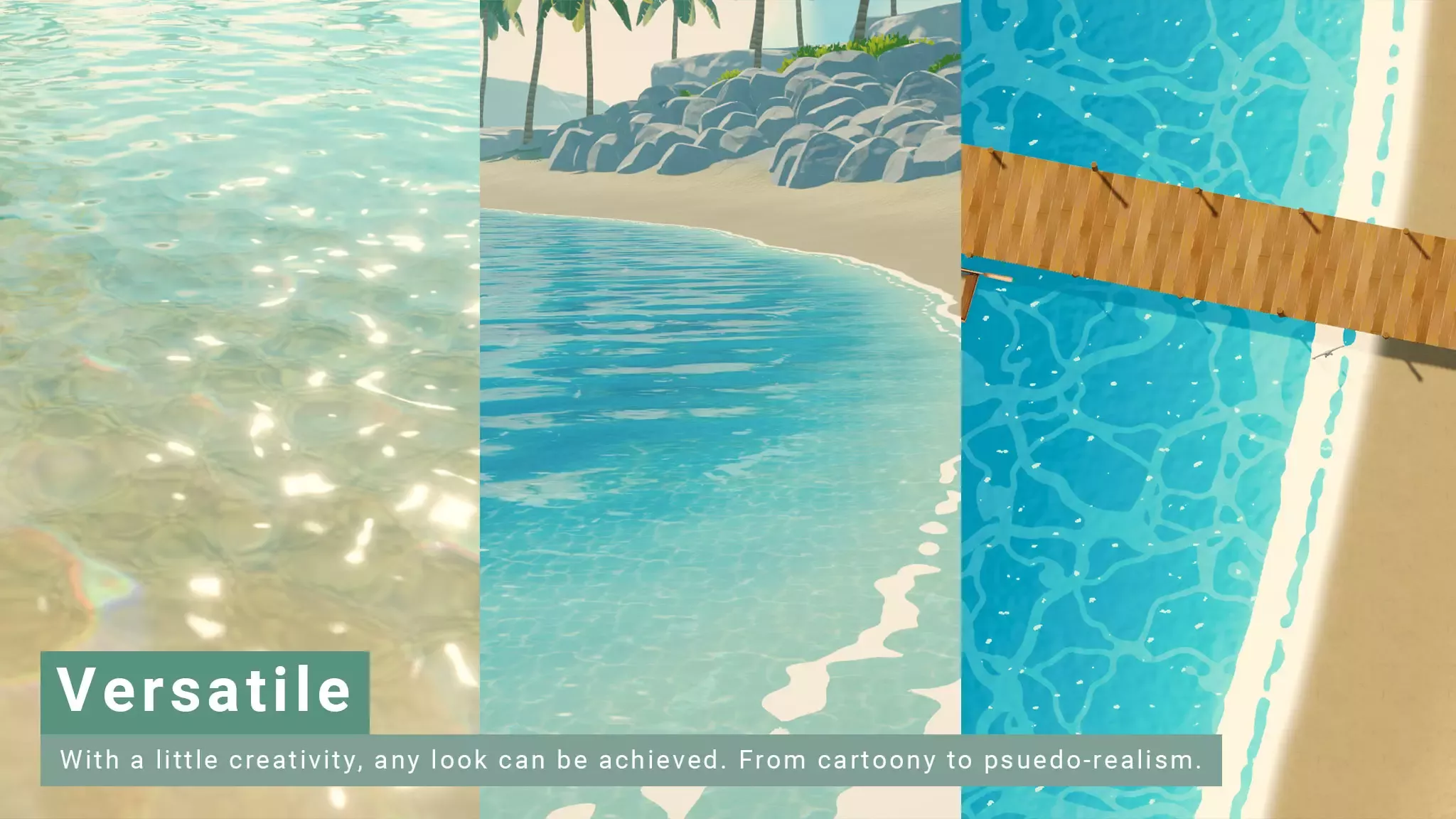 Легко настраиваемый в соответствии с вашим художественным направлением с помощью различных параметров. Этот пакет ориентирован на предоставление художественной свободы, а не на реалистичную имитацию воды. Простой в использовании и самодокументируемый