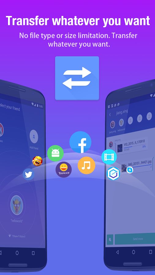 Приложение T SHARE 1.6.0.1071 позволяет легко обмениваться приложениями, музыкой, фотографиями и другими файлами между смартфонами на Android, iOS и персональными компьютерами. Оно создает прямое беспроводное соединение, обеспечивая высокую скорость передачи без использования мобильного интернета, что помогает существенно экономить трафик.