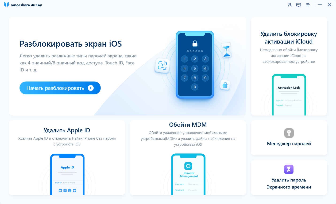 Tenorshare 4uKey v3.7.3 — мощная программа для разблокировки устройств iOS. Она помогает пользователям легко и быстро удалить экранный пароль, включая Face ID, Touch ID и 4-значные или 6-значные коды. Инструмент полезен, если вы забыли пароль, получили подержанное устройство или экран блокировки не реагирует.