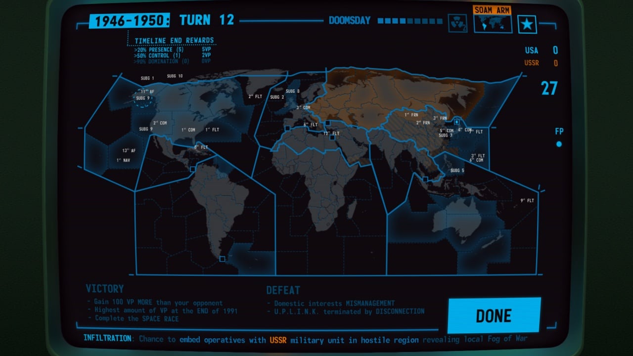 В игре **Terminal Conflict** разворачивается холодная война между мировыми державами, борющимися за господство и влияние. Игрок становится одним из участников этого противостояния, где можно либо восстановить глобальное равновесие, либо обеспечить доминирование одной из стран. Для анализа событий и противодействия соперникам используется ретро-терминал, через который отслеживаются их действия. Проект сочетает в себе элементы симулятора и масштабной политической стратегии.