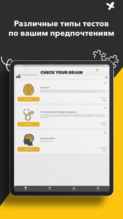ТЕСТ ДЛЯ МОЗГА – ПСИХОЛОГИЧЕСКИЙ И IQ ТЕСТ объединяет лучшие викторины и задачи в одном месте. Некоторые тесты потребуют серьезной умственной работы, другие же помогут отвлечься и взглянуть на себя под новым углом. Это интересный способ с пользой провести время.