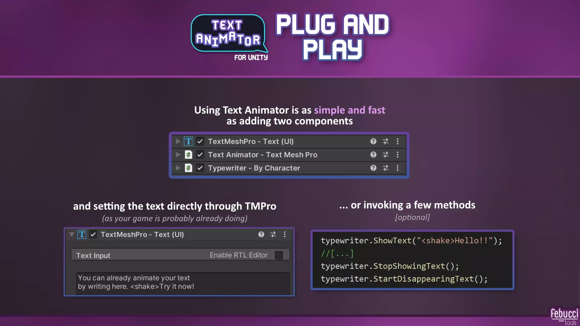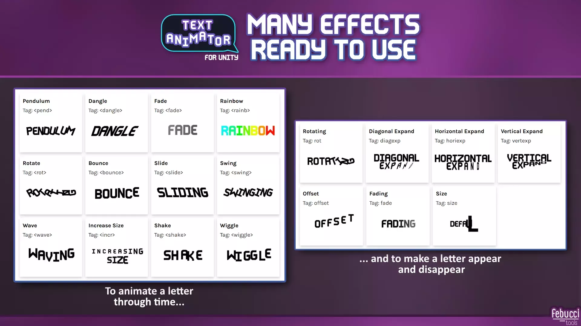Вы можете анимировать буквы и комбинировать эффекты (от встроенных до пользовательских), динамически отображать текст с разной скоростью (например, символы, puntuactions и слова), запускать игровые события при отображении определенной буквы и многое другое! Работает на любой платформе и конвейере рендеринга.
