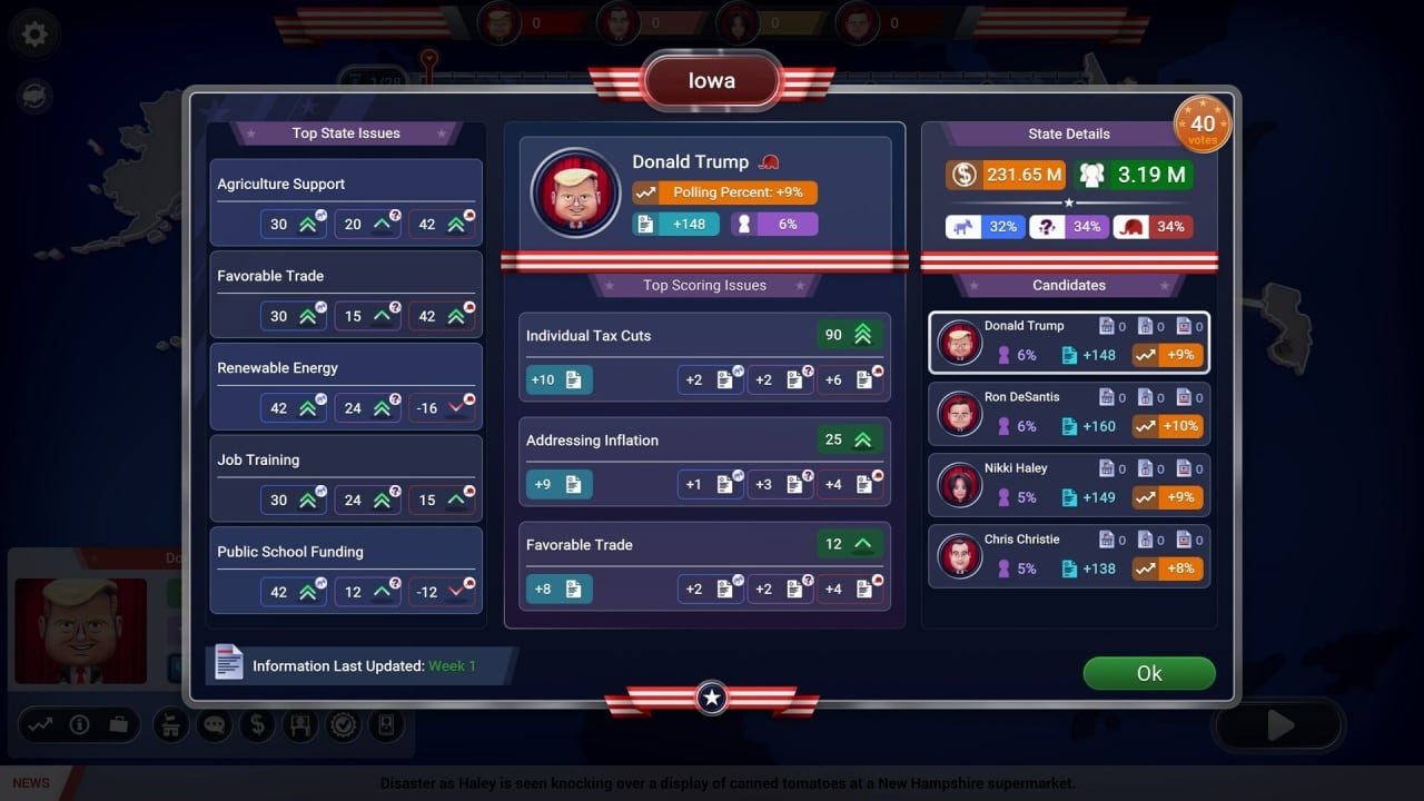 Представьте: вы запускаете жёсткую атаку в СМИ, чтобы разрушить тщательно выстроенный имидж соперника, или получаете неожиданную поддержку знаменитости, чтобы переманить колеблющихся избирателей. Вот что такое настоящая избирательная кампания в этой игре! Но и это ещё не всё. Дорога к Овальному кабинету начинается с праймериз. В The Political Machine 2024 вам сначала нужно завоевать доверие своей партии, прежде чем выйти на национальный уровень. Вам предстоит тонкий баланс между партийной линией и главной целью — завоевать сердца и голоса простых американцев.