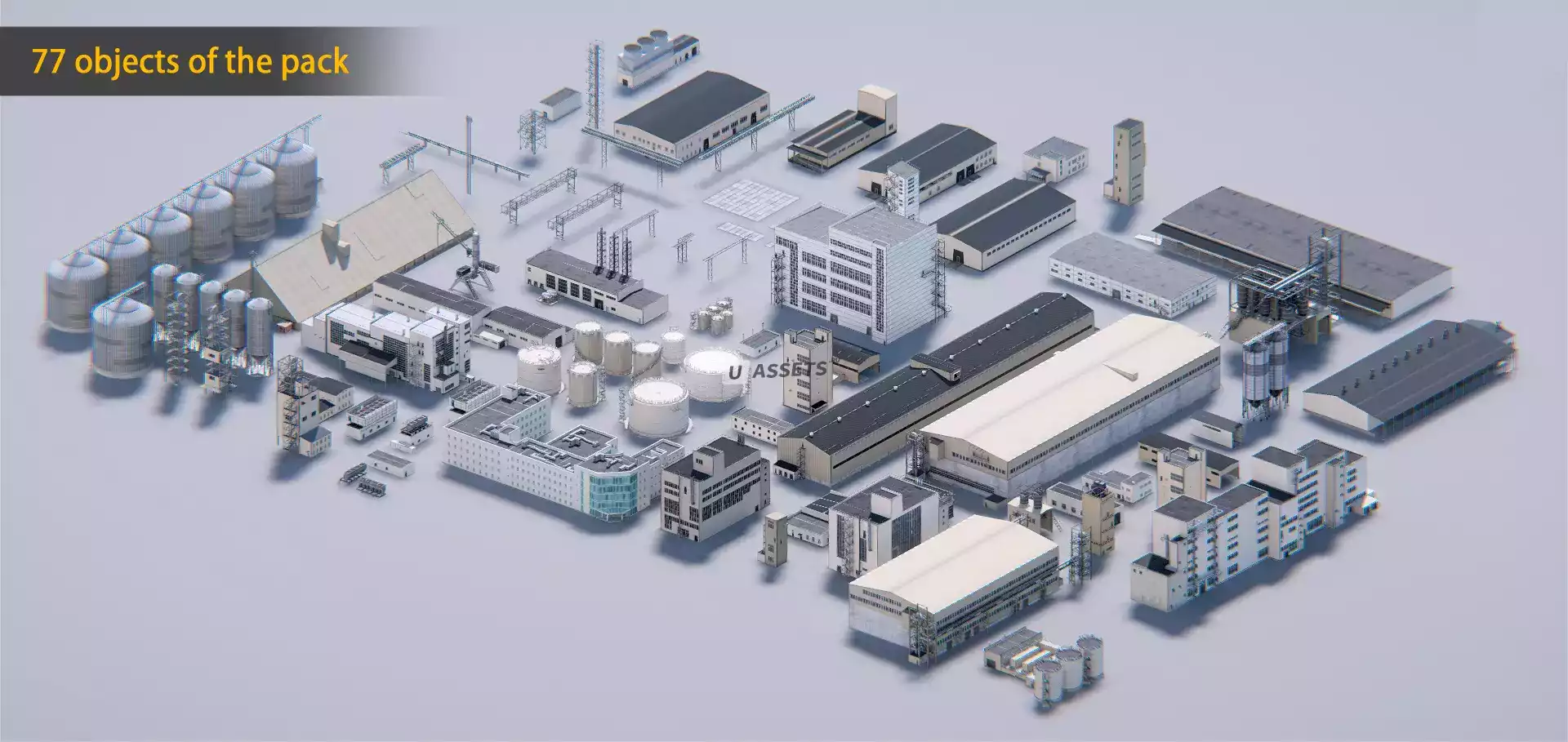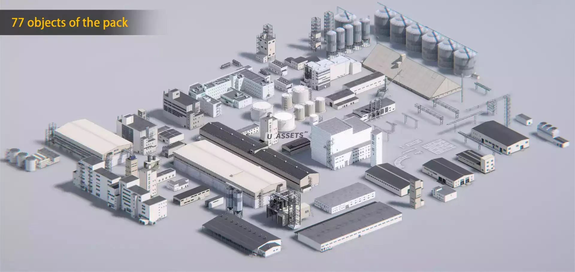 Этот набор 3d-моделей и текстур позволяет создавать различные перерабатывающие предприятия. В комплект входят напольные конструкции для хранения, резервуары для хранения масла, конструкции из металла и другие объекты.