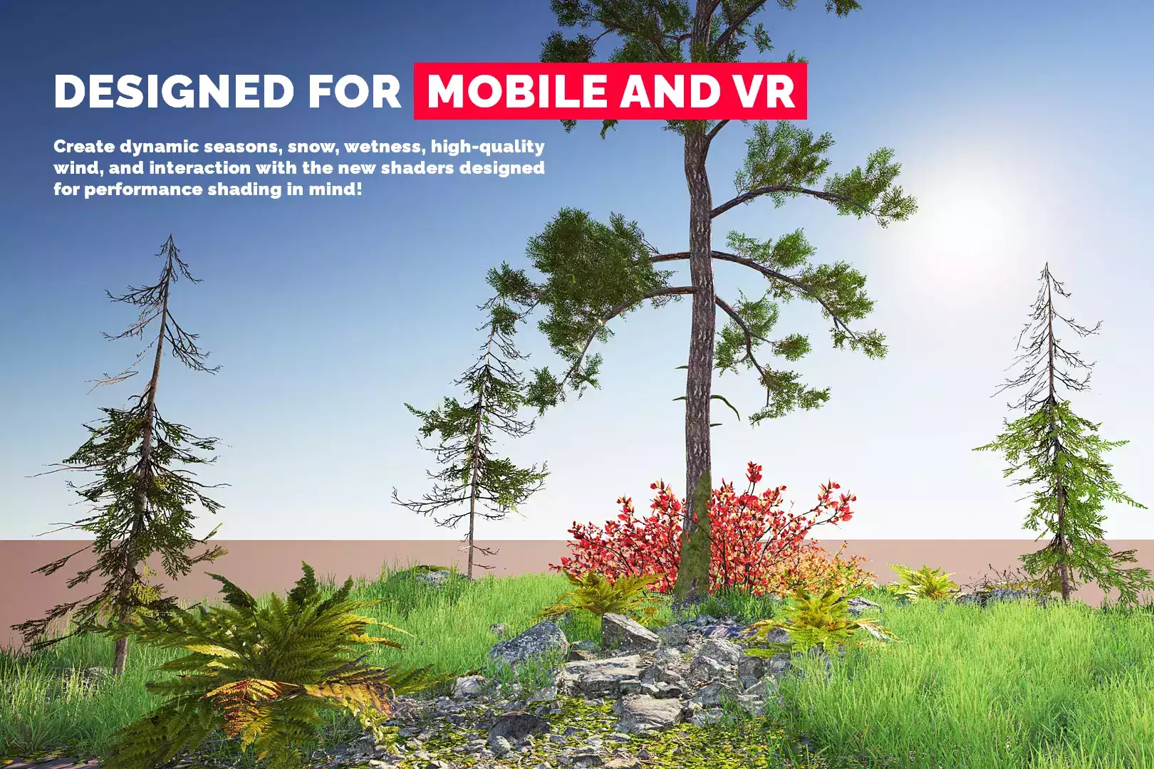 🛈 Движок Vegetation Engine - это набор высококачественных шейдеров и инструментов, предназначенных для объединения сторонней растительности в рамках одной системы. Обеспечьте высококачественное движение ветра, взаимодействие, времена года, влажность, подповерхностные условия, смешивание с учетом высоты и т.д. для всех растительных ресурсов со стандартным, универсальным или HD-конвейером рендеринга!
