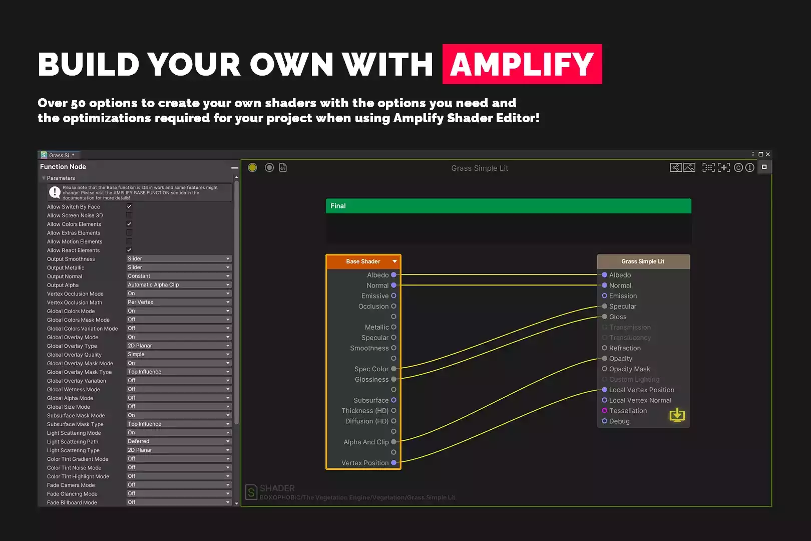 ⚑ В мобильных шейдерах всегда включены базовые функции, такие как снег, влажность, затухание размеров, цвета и поддержка вершинных элементов! Их можно дополнительно оптимизировать с помощью функции Amplify Base, отключив ненужные функции!