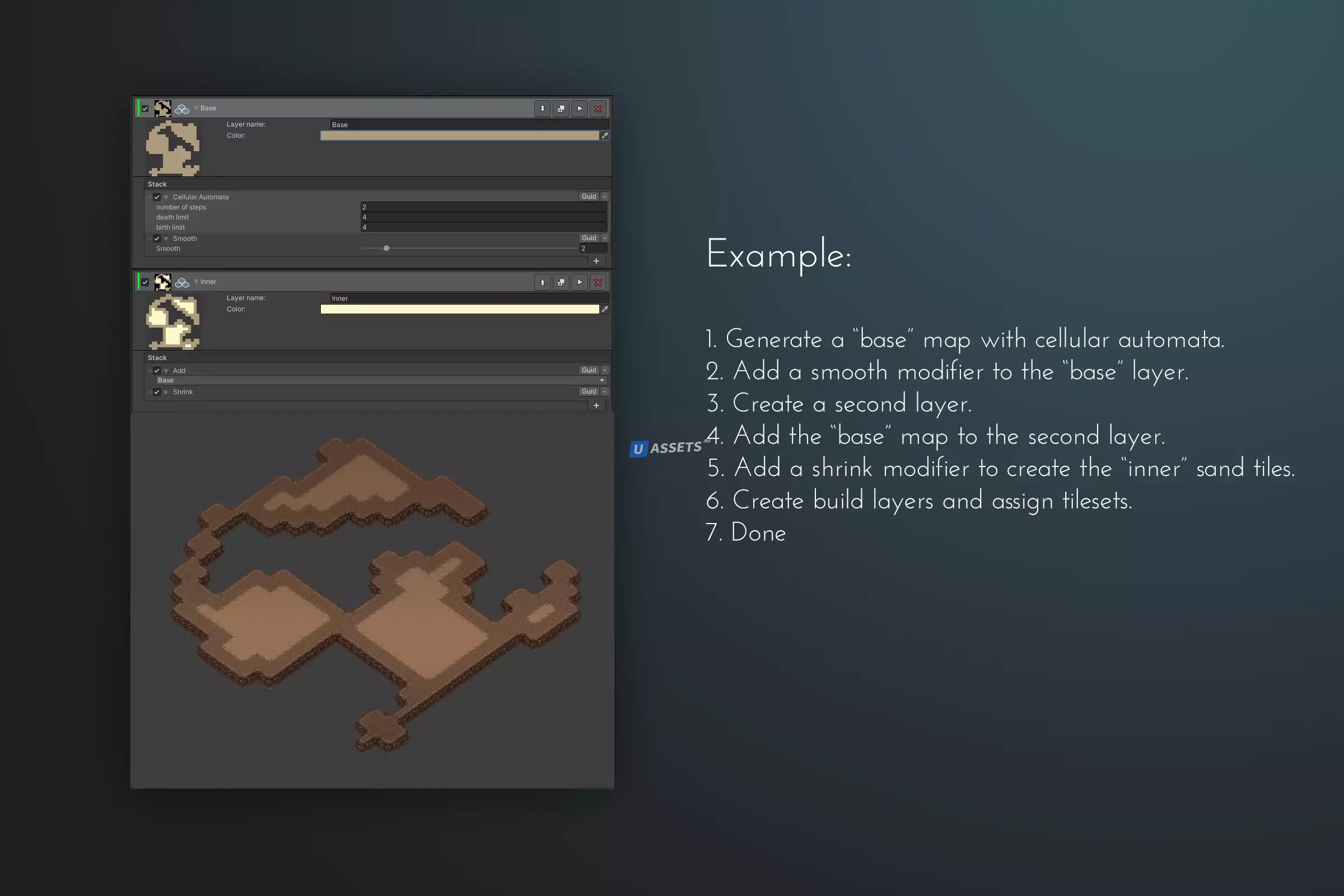 Создавайте свои карты с помощью доступных генераторов и модификаторов, создавайте несколько слоев и используйте выбор и алгоритмы на основе правил для различных частей вашей карты. Используйте слои "сборка" для создания экземпляров листов или объектов из слоев схемы элементов.