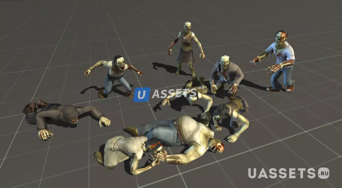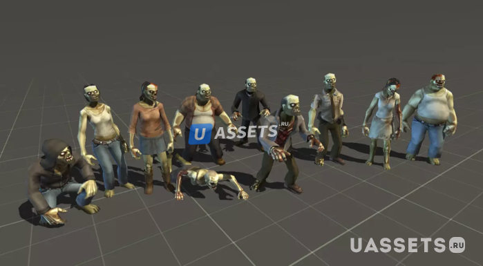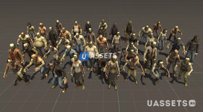 4 настраиваемые модели зомби: -Мужчины Зомби -Женщины-зомби -Халк Зомби -Танковые Зомби 2 x 2048x2048 цветные текстуры для всех персонажей 61 префаб зомби и предустановленные модели с одной сеткой, в том числе: Гражданские лица мужского пола, гражданские женщины, полиция и военные, зараженные и зараженные зомби, невидимые зомби в капюшонах, священники, большие боссы. 62 модели трупов зомби. 79 анимаций: -Спокойный анимационный набор -Агрессивный набор анимаций - Сломанный набор анимации -Набор ползающих анимаций -Смерть и пробуждение (x3) -20 других общих анимаций зомби Важный: Этот пакет содержит только графический материал (модели, текстуры, материалы и анимацию). Никакие сценарии или контроллеры любого рода не включены.