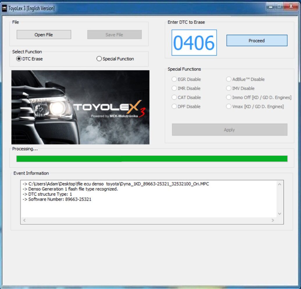 Программа ToyoLex 3 предназначена для отключения DPF, EGR, Adblue, lambda, immo, DTC, в прошивках автомобилей Toyota и Lexus с блоками Denso. Программа позволяет работать с файлами первого, второго и третьего поколения (Gen 1, Gen 2, Gen 3) ЭБУ Denso от автомобилей Тойота и Лексус, функция отключения ошибок DTC и позволяет отключать специальные функции на дизельных, бензиновых и гибридных двигателях.