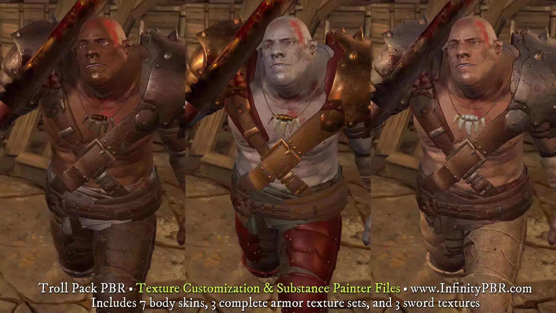 Этот персонаж-тролль поставляется с кучей готовых к использованию материалов - тремя материалами для мечей, тремя полными наборами доспехов и 7 текстурами тела. Все они также поставляются с файлами Substance Painter, так что вы можете настроить текстуры в соответствии с вашей игрой.