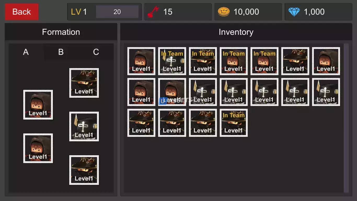 - Персонаж с различными характеристиками (HP, Физическая Атака, Магическая Атака, Физическая Защита, Магическая Защита, Уклонение, Точность, Уровень урона от Блока, Шанс Блока, Критический Урон, Критический Шанс)