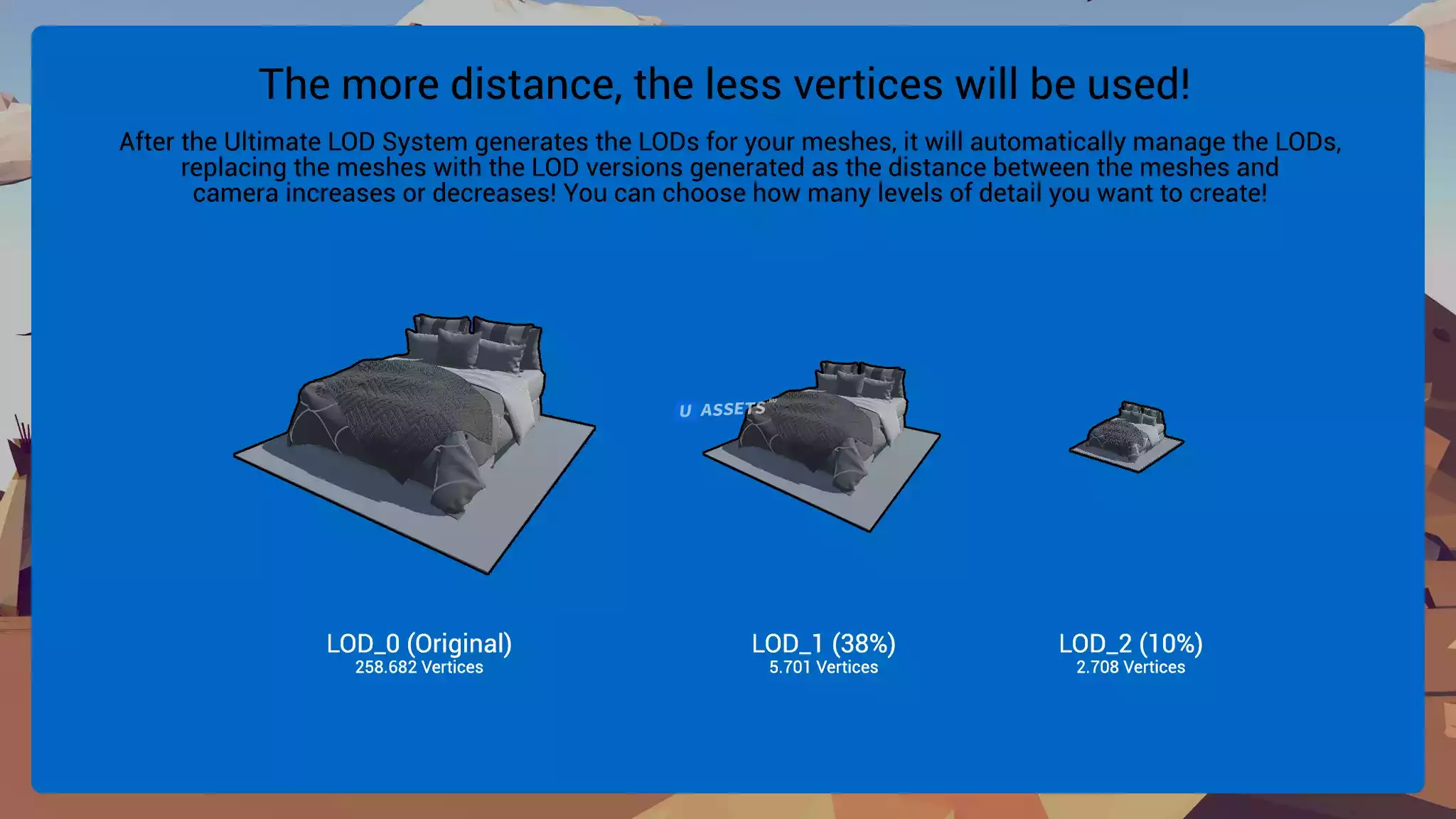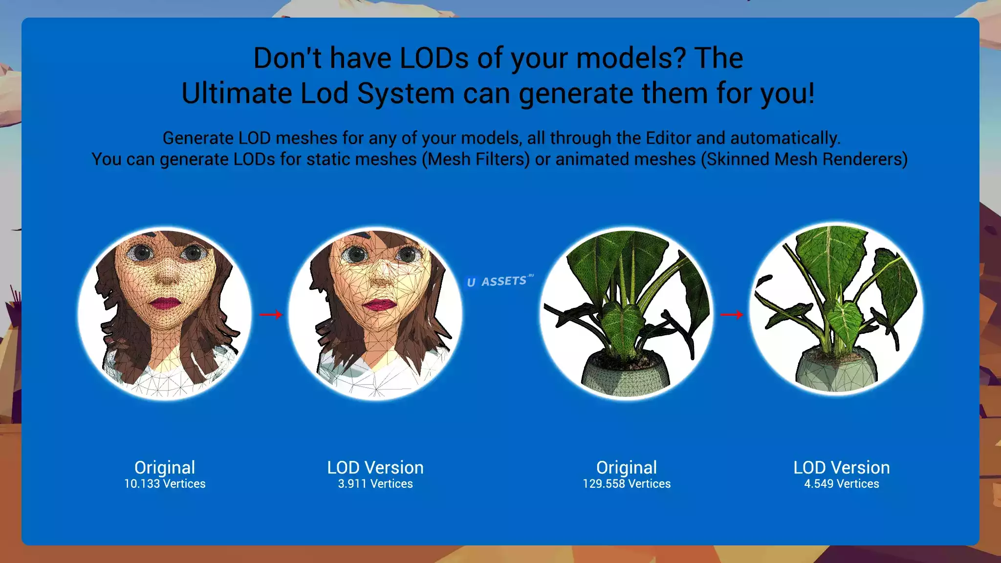 Ultimate LOD System — это комплексное решение для оптимизации вашего проекта на основе LOD! Вы можете генерировать LOD из своих исходных мешей или просто генерировать их упрощенные версии.