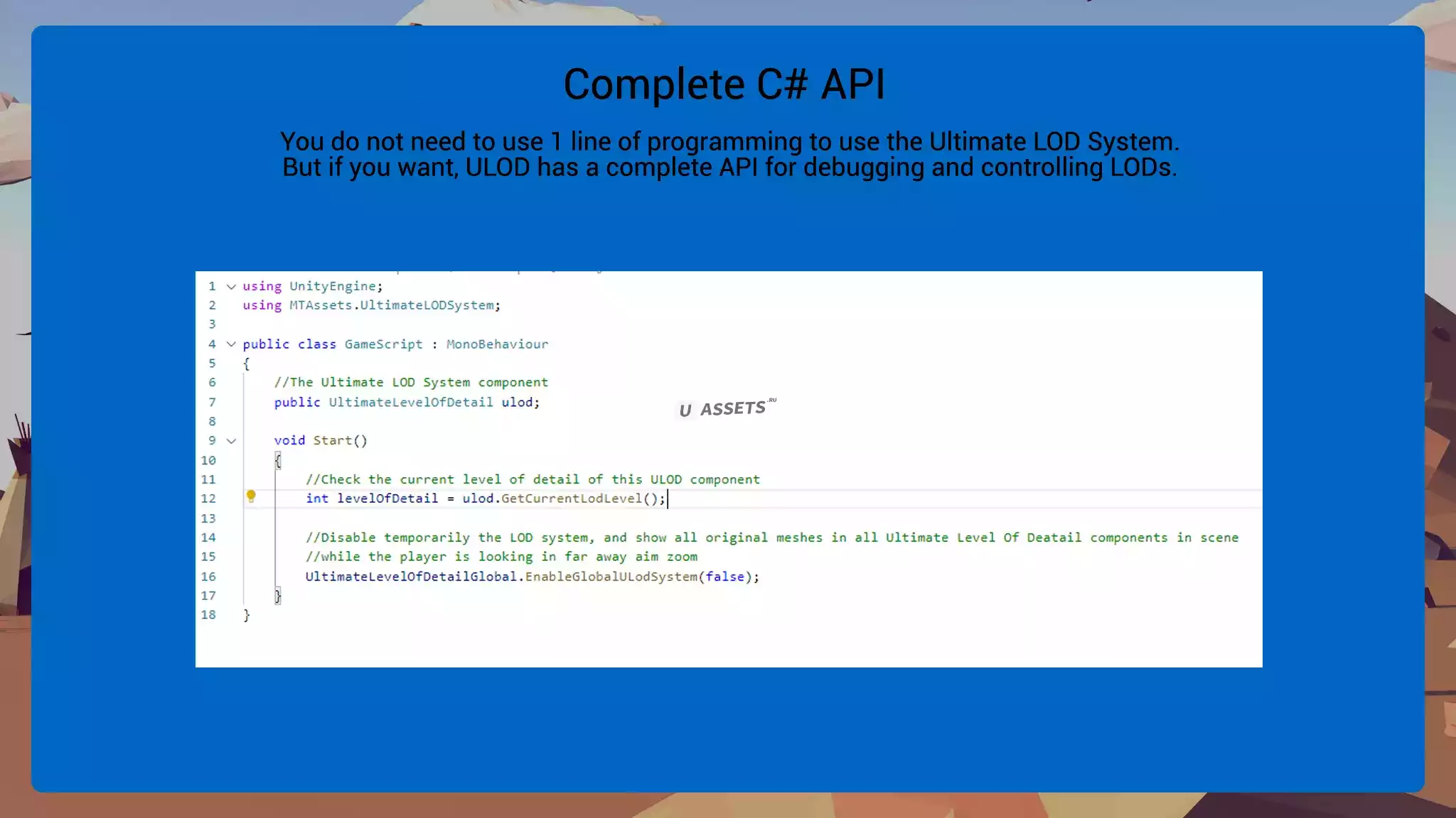 ● Ultimate LOD System имеет C# API, так что вы можете выбрать, когда система может работать. Например, когда игрок смотрит на горизонт через увеличенный прицел, можно отключить систему LOD, чтобы отображались только исходные меши, а когда игрок перестанет смотреть на прицел, можно с помощью API C# включить снова включите систему и снова отобразите уровни детализации. Конечно, система LOD всегда включена по умолчанию!