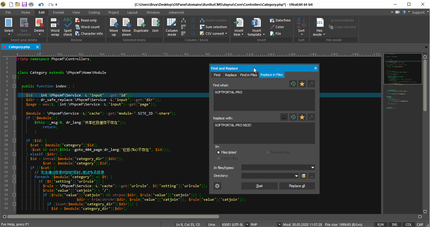 Кроме этого UltraEdit обладает расширенным поиском и заменой по текстовым файлам, это позволит моментально находить нужный фрагмент кода или текста, и сэкономит время. Одной из важнейших возможностей является поддержка работы с большими файлами, до 4 ГБ, и более, и это действительно важно, на собственном опыте столкнулся с этой проблемой в других редакторах при открытии, например, SQL файла базы данных более 1 ГБ редакторы либо “падали”, либо зависали на продолжительное время. Программа имеет полностью настраиваемое отображение клавиатуры, подсветку синтаксиса и подсветку, модуль проверки орфографии, а также полезную панель инструментов поиска (Google, Yahoo, Wikipedia, PHP.net, cplusplus.com).