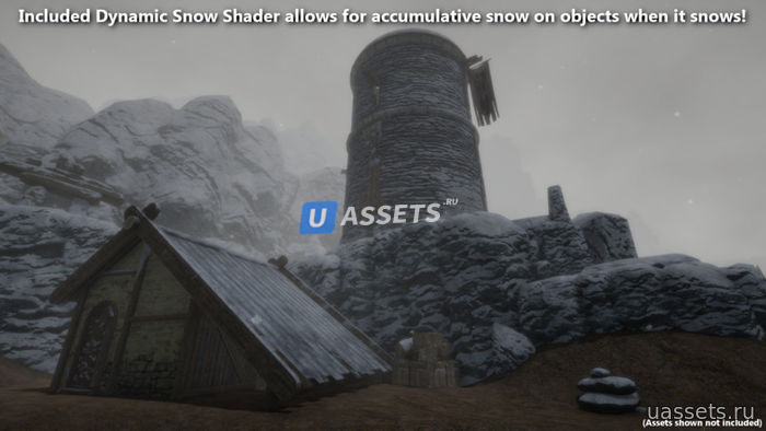 Глобальный погодный шейдер UniStorm позволяет объектам получать затенение от дождя и снега во время дождливых и снежных погодных условий. Затенение от дождя позволяет поверхностям становиться более блестящими, но только на поверхностях не более 90 градусов. Внутренняя поверхность большинства поверхностей будет казаться сухой, например, внутри зданий и крыш. Снег, будет функционировать так же, но с накопительным затенением снега. Текстуру снега, текстуру снежного бугра и уровень отражения снега можно настроить. Когда погода не идет ни дождем, ни снегом, UniStorm отключит затенение погоды.