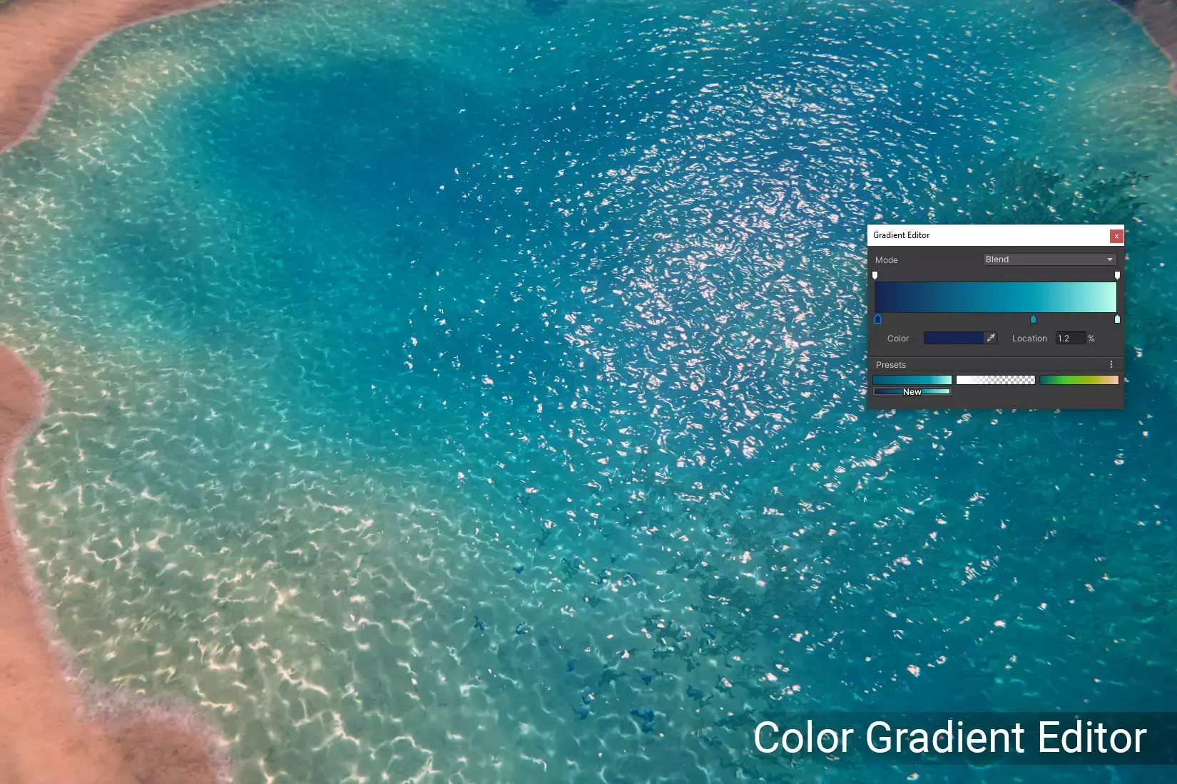 Для управления цветом воды используйте цветокорректор или редактор градиентов.