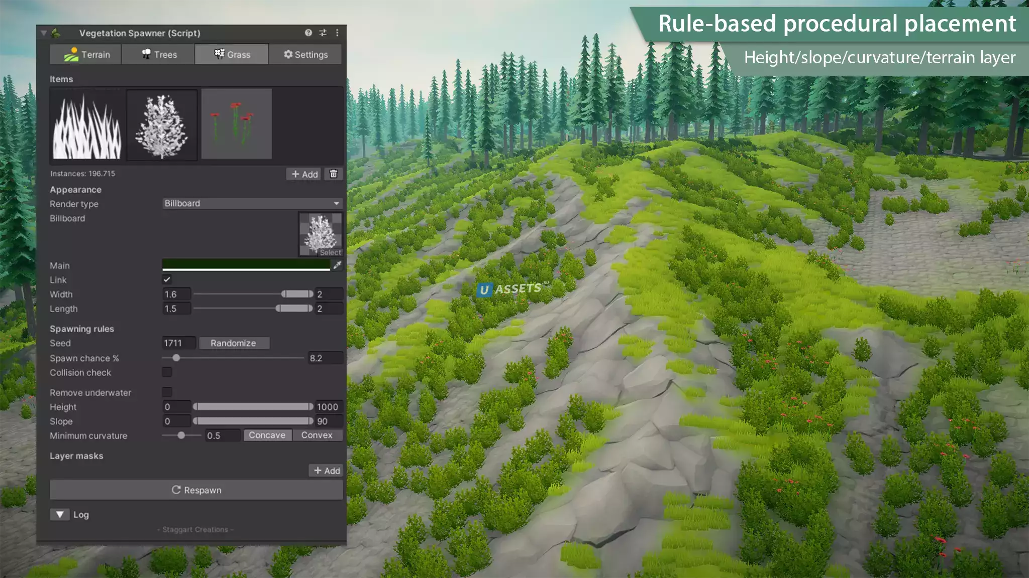 Простой, но мощный процедурный генератор растительности для системы растительности Unity. Позволяет быстро заселить местность растительностью, не тратя дни на кропотливую ручную покраску. Работает с любым другим активом, использующим встроенную систему растительности, например, с Nature Renderer или GPU Instancer.