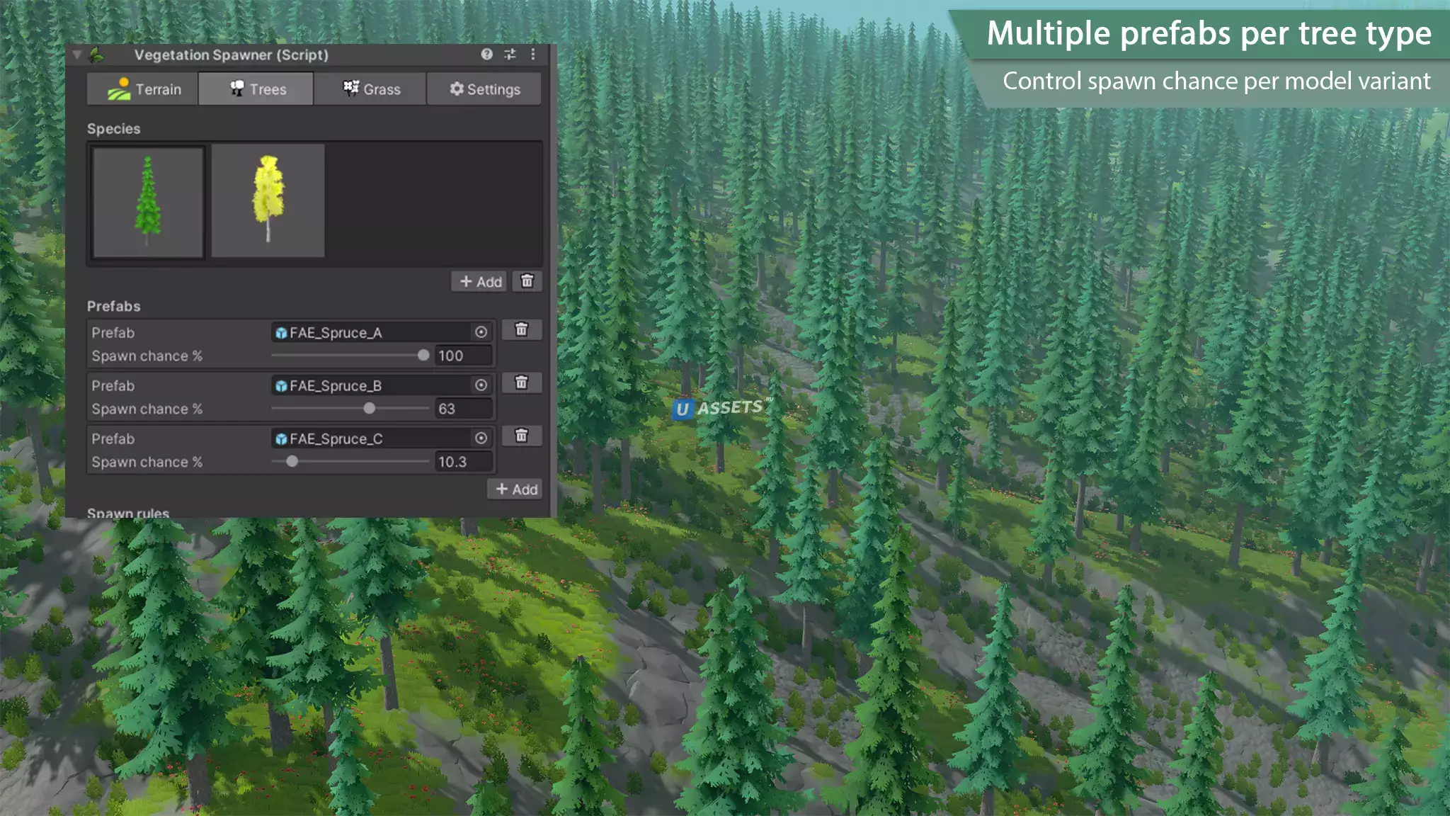 Деревья определяются как «виды» и могут иметь несколько префабов, каждый из которых имеет свой собственный шанс появления. Это позволяет создавать варианты одного и того же дерева с одним набором правил. Точки возрождения одного и того же вида никогда не пересекаются!