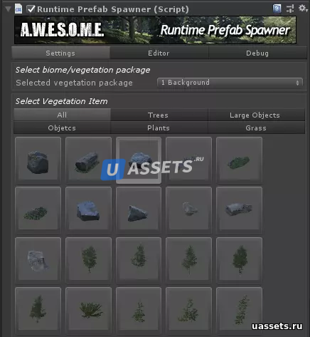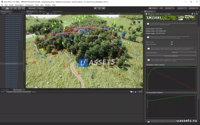 Растительность создается на местности на основе гибкого набора правил и контролируется как текстурой, так и полигональными масками. Существует также обширная система биомов, которая позволяет вам определять области с пользовательскими биомами и правилами splatmap.