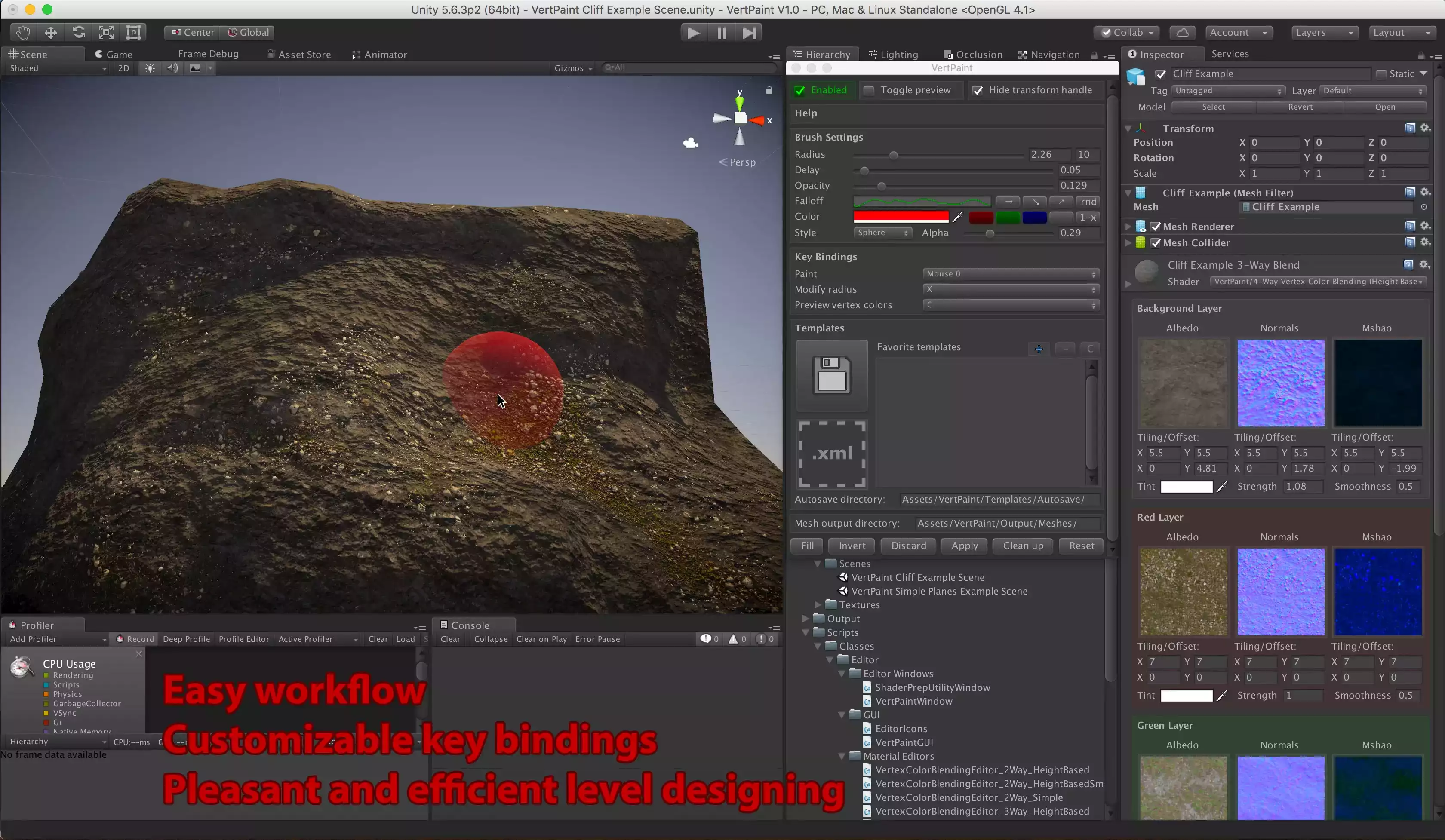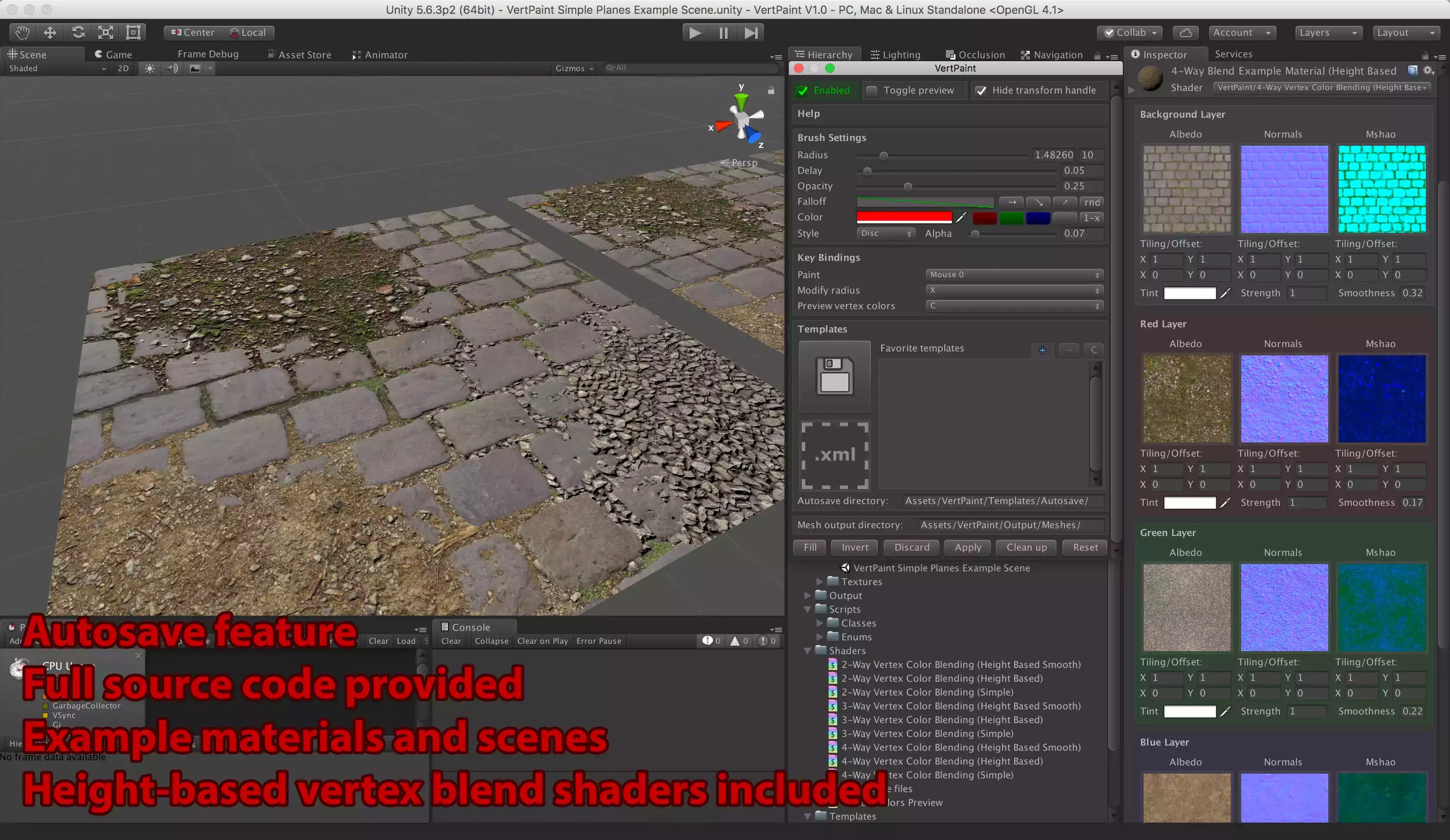 Но VertPaint - это не просто утилита для рисования необработанными цветами вершин (хотя вы можете использовать ее как таковую, если хотите), она также поставляется с хорошим набором пользовательских шейдеров для смешивания цветов вершин, которые варьируются от простых 2-полосных до сложных 4-полосных смесей на основе высоты. Это позволяет вам добиться улучшенных эффектов смешивания материалов, как показано на скриншотах.