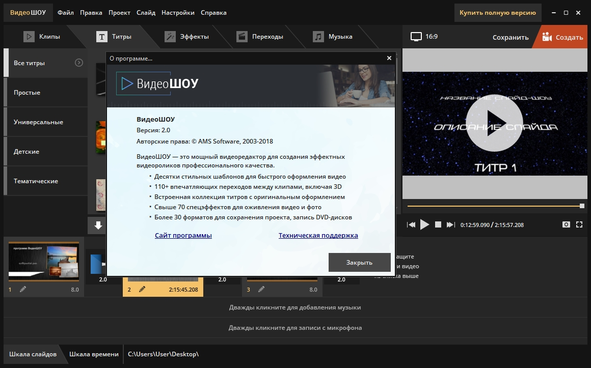«ВидеоШОУ» - Один из лучших на сегодня видеоредакторов от Российского разработчика AMS Software, основное отличие от других редакторов, простота и широкие возможности из коробки.