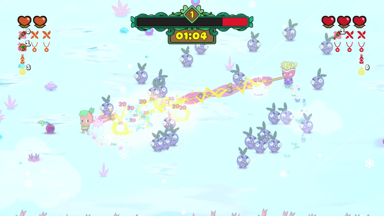 В этой игре магическая лоза — не просто путы, а инструмент для построения стратегии. Оружие и время его перезарядки передаются по ней между игроками, создавая увлекательную систему «пинг-понга». Каждый тип оружия требует особого подхода, позволяя адаптировать тактику под найденные улучшения и личные предпочтения. К примеру, Банановый Меч наносит сокрушительные удары в одном направлении, а Клубничный Посох открывает доступ к мощной магии, что вносит огромное разнообразие в каждый бой.
