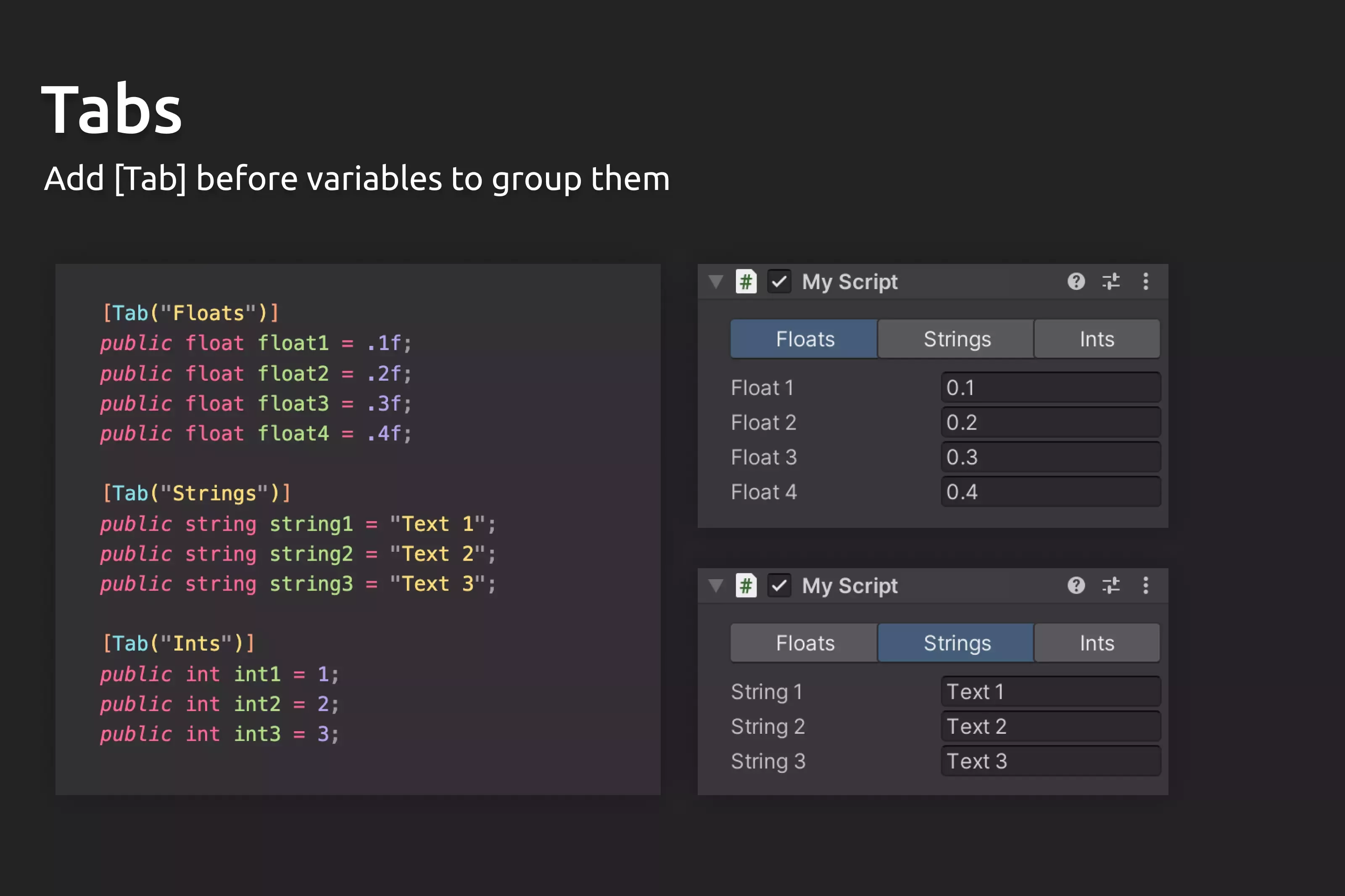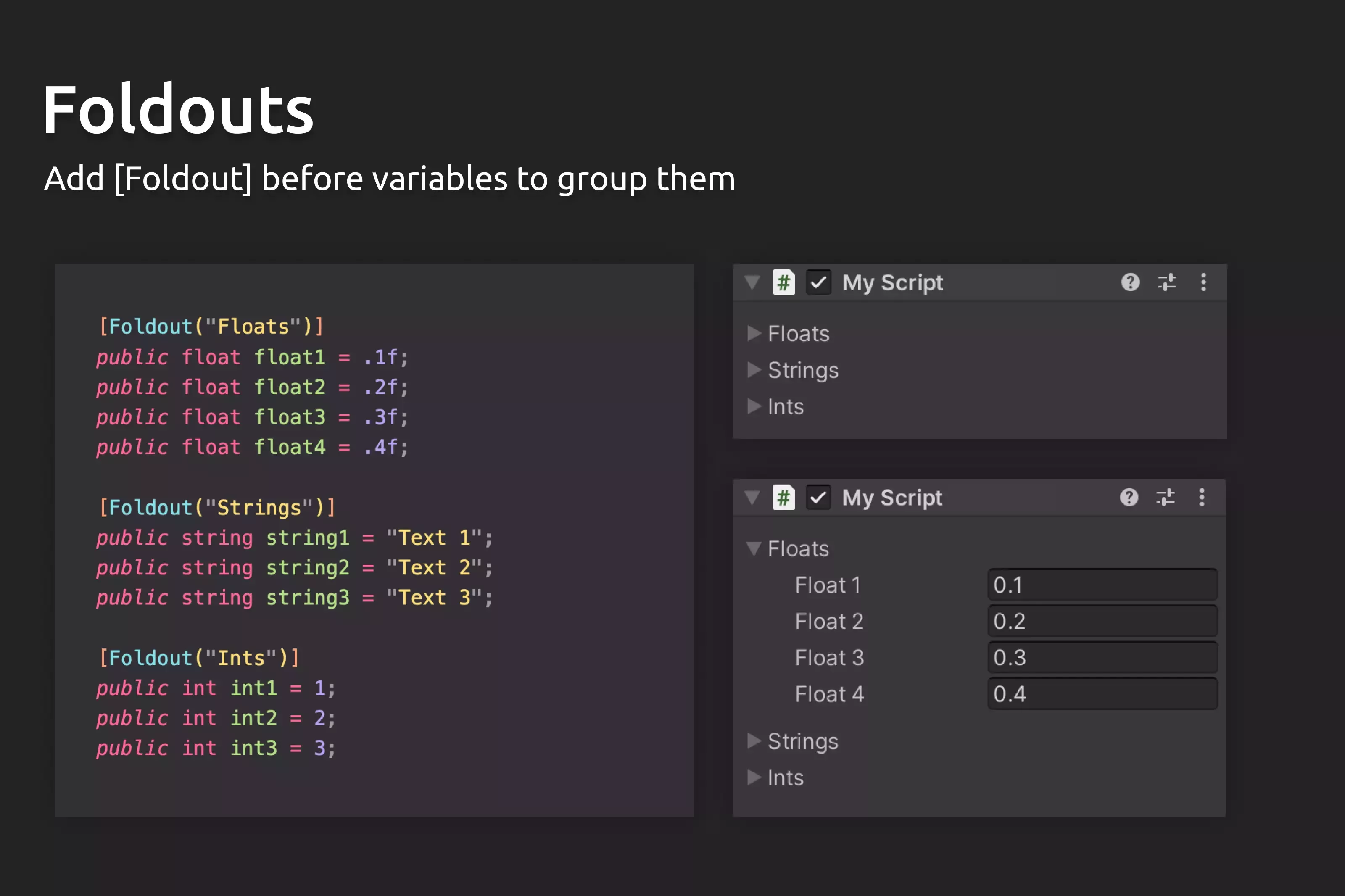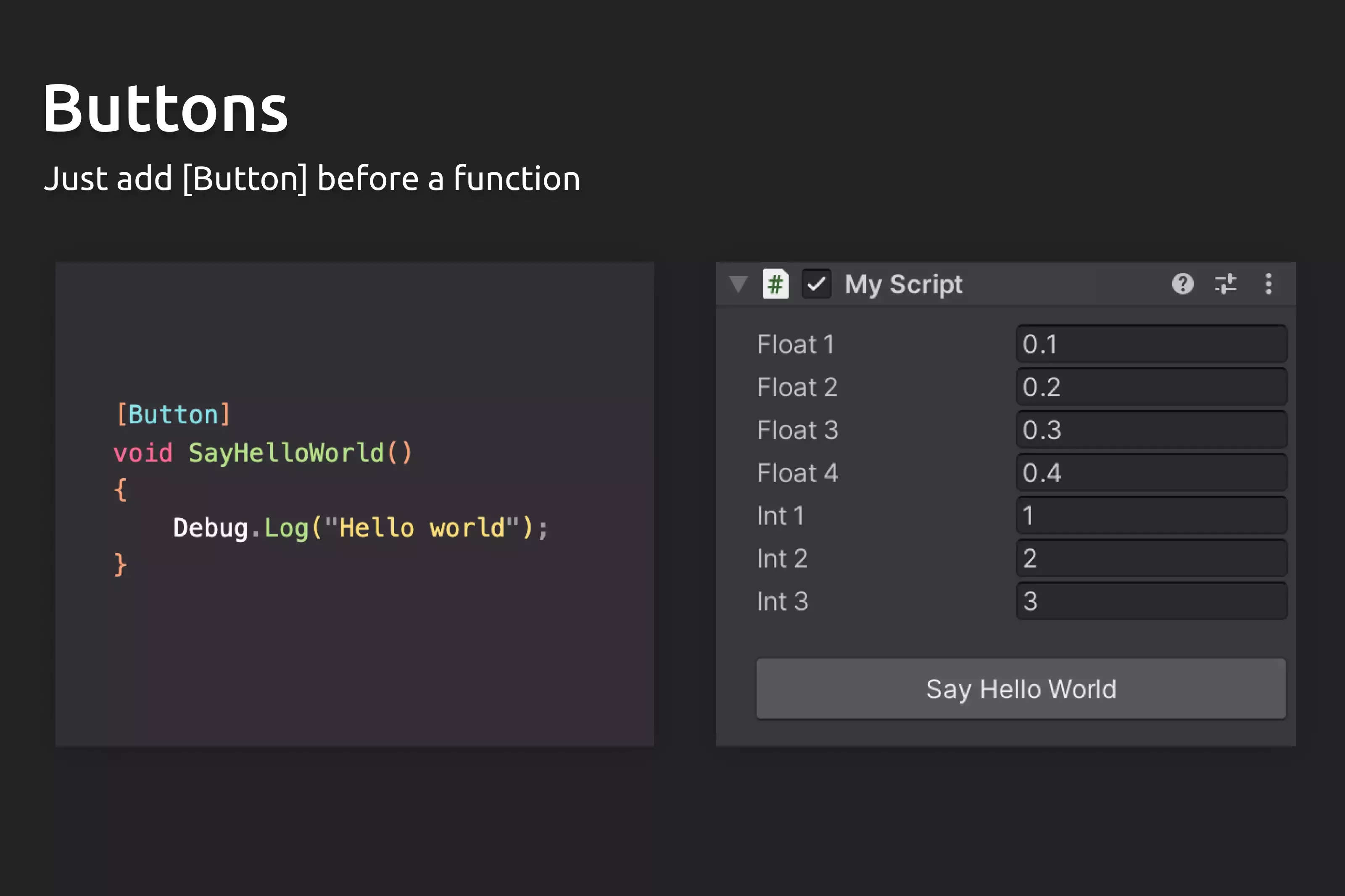 - Поддерживаются все встроенные атрибуты unity