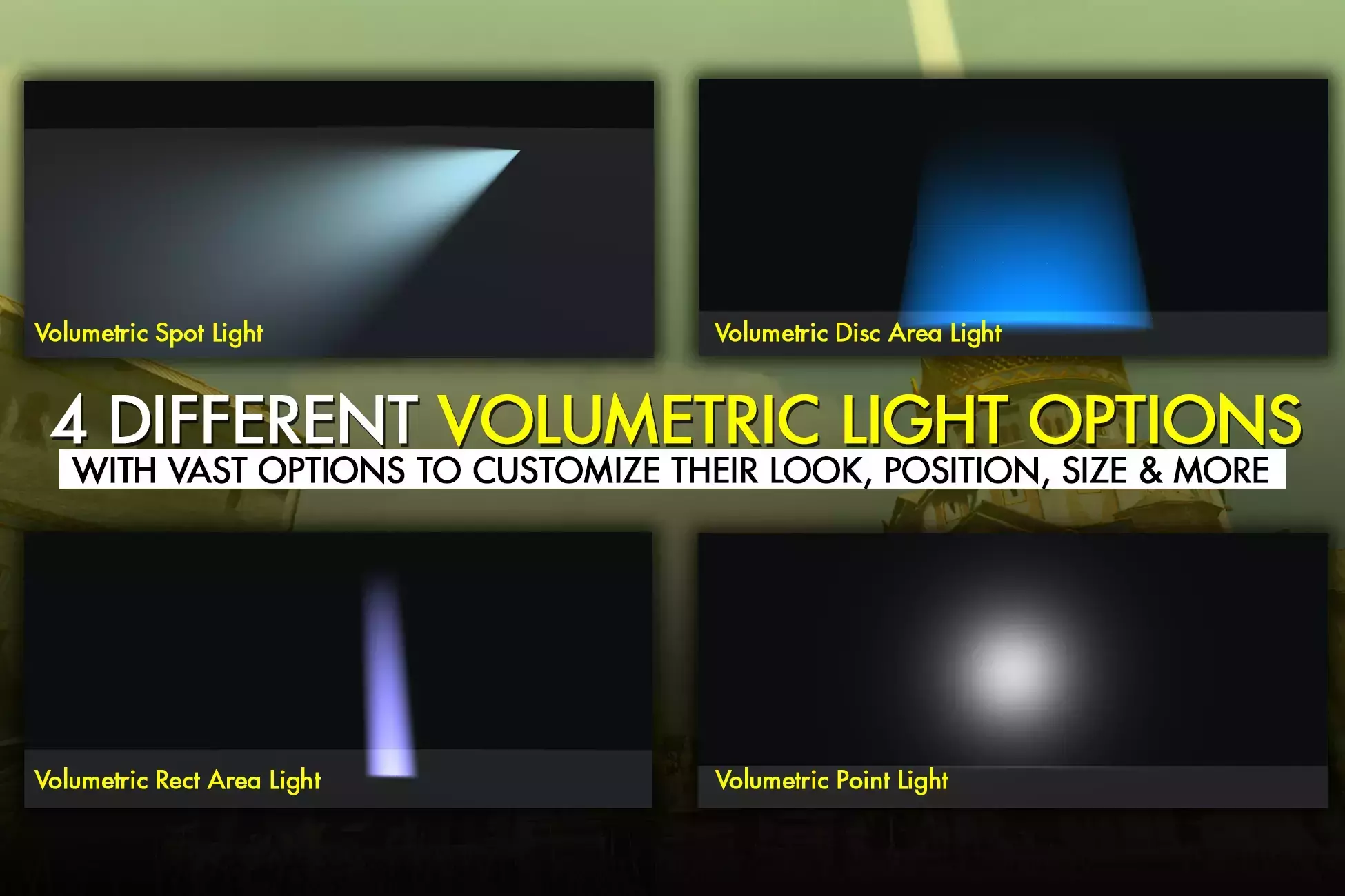 Добавьте скрипт VolumetricLight к вашим источникам освещения и настройте его. Эффект автоматически подбирается под тип освещения, угол наклона, диапазон, цвет и т.д. и дополняется новыми объемными функциями и опциями.