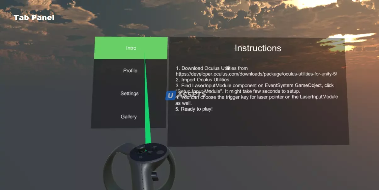VR UIKit - это UI framework для быстрого и легкого развития VR. It includes many battle-tested components that have been widely used in VR development. For example, VR keyboard, Gallery list, Multi-level menus, and etc.