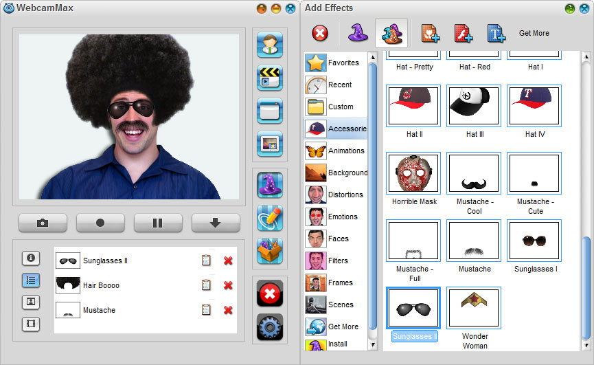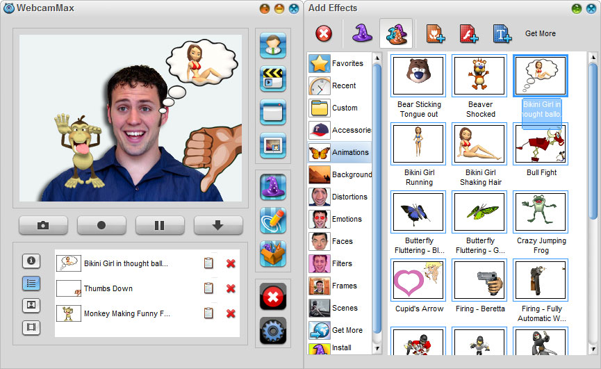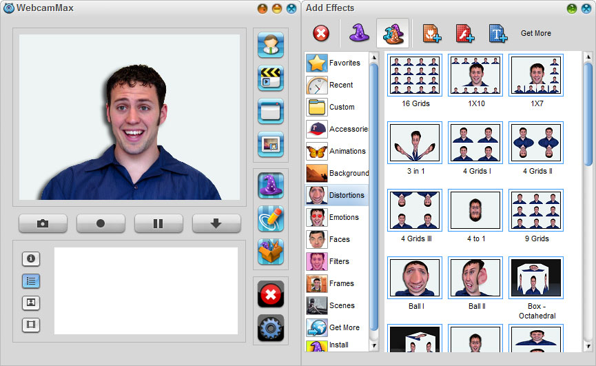 WebcamMax - это программа, которая позволяет накладывать эффекты в реальном времени на картинку с веб-камеры и отправлять через популярные мессенджеры (ICQ, AIM, MSN, Camfrog, Skype, Paltalk, Yahoo, ANYwebcam, Stickam и т. Д.)