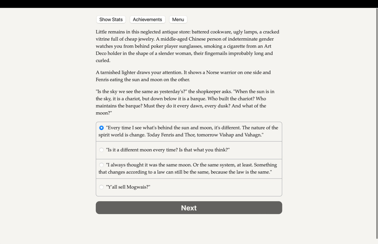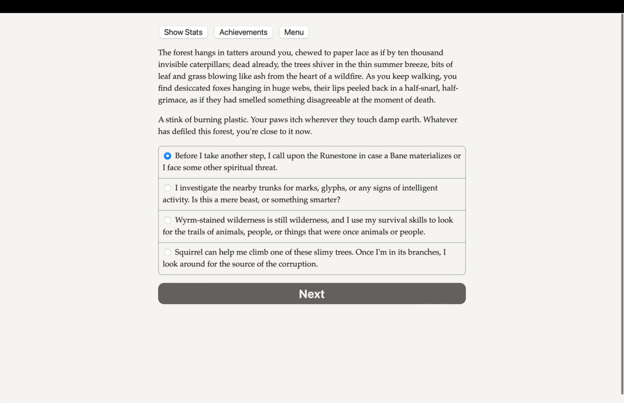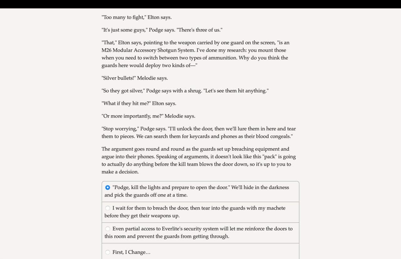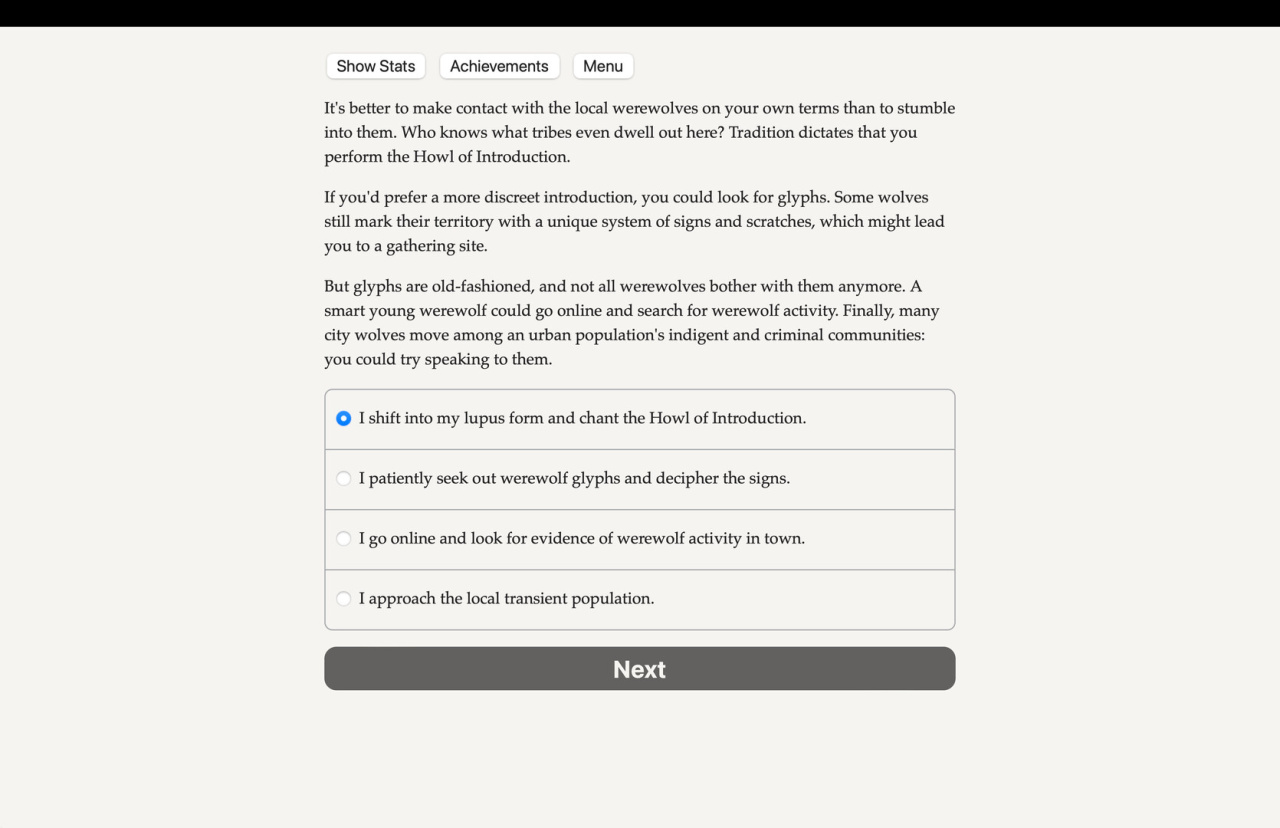 Werewolf: The Apocalypse - The Book of Hungry Names — это интерактивный текстовый роман, действие которого разворачивается в мрачном сеттинге Мира Тьмы. Игроки берут на себя роль одного из последних оборотней-защитников живой планеты Гайя. Сюжет игры строится вокруг противостояния с коварным Духом Вирма — сущностью, питающейся ложью и человеческими заблуждениями. Путешествуя по запутанному миру, вы будете принимать сотни решений, напрямую влияющих на развитие истории и её финал.