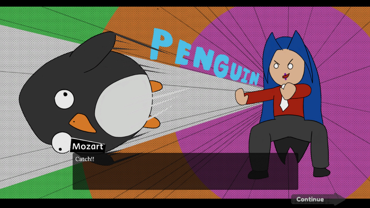 Их главная миссия — предотвратить коварные планы Моцарта до того, как ледяной континент будет стерт с лица земли. По ходу повествования игроков ждут неожиданные повороты, напряженные моменты и встречи не только с пингвинами, но и с другими известными личностями из разных эпох, оказавшимися в необычных обстоятельствах. Взаимодействие с миром игры происходит через чтение текста и созерцание статичных иллюстраций персонажей, что является классикой для жанра визуальных новелл. Эта игра создает уникальный сценарий, где причудливо переплетаются пародия и дух приключений.