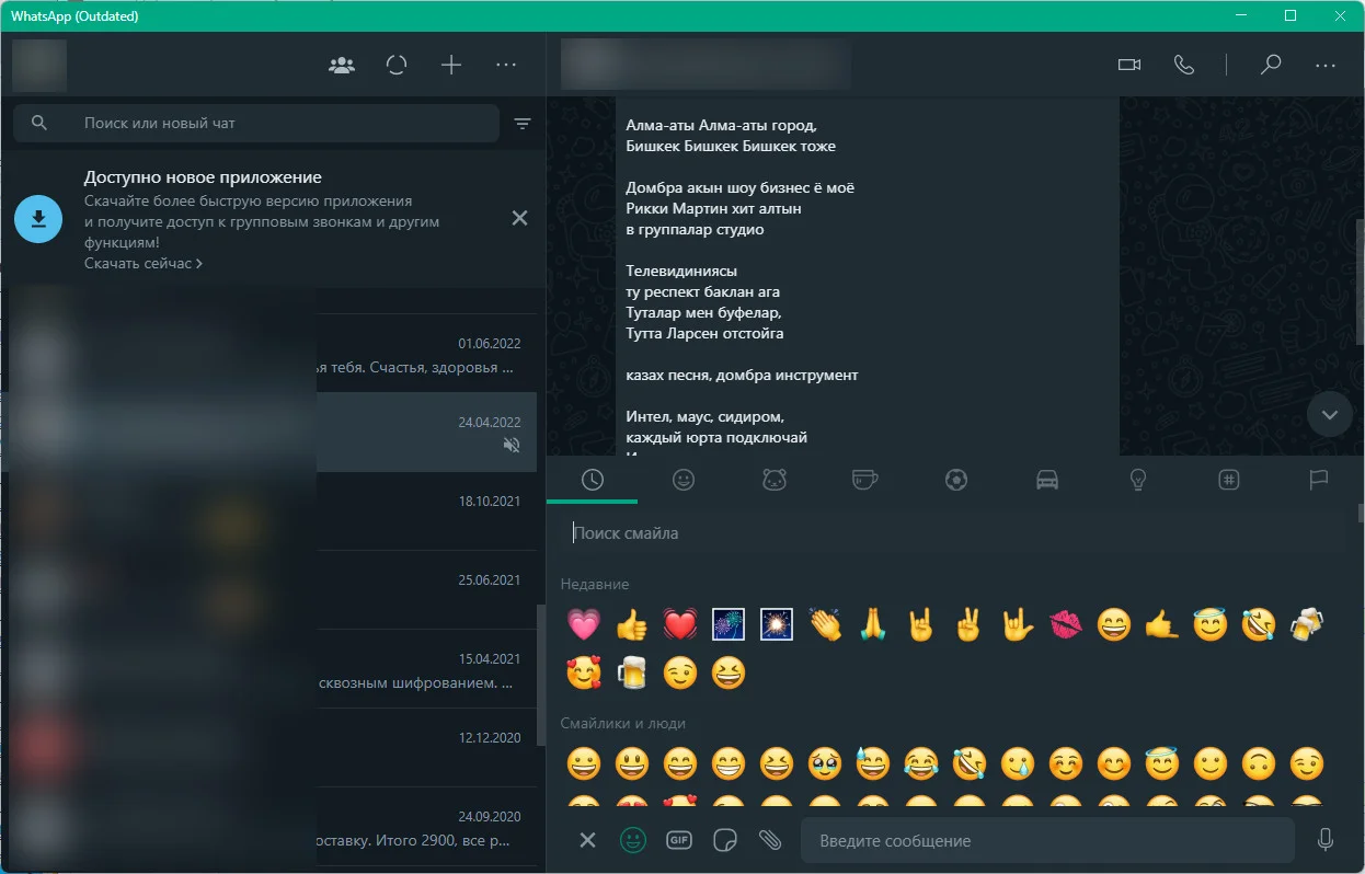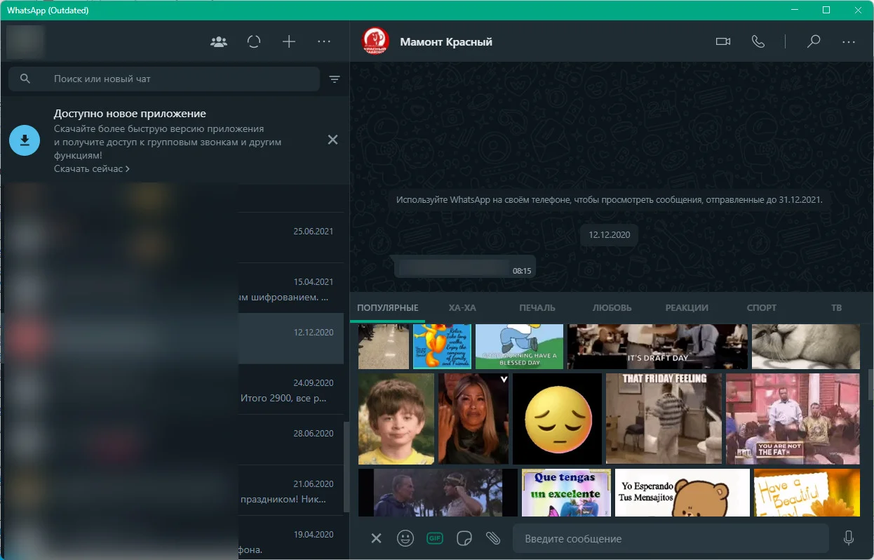 WhatsApp (outdated) 2.2318.10 — это версия популярного кроссплатформенного мессенджера для компьютеров под управлением Windows. Приложение позволяет бесплатно обмениваться сообщениями, используя интернет-соединение, что делает его удобной альтернативой платным SMS.