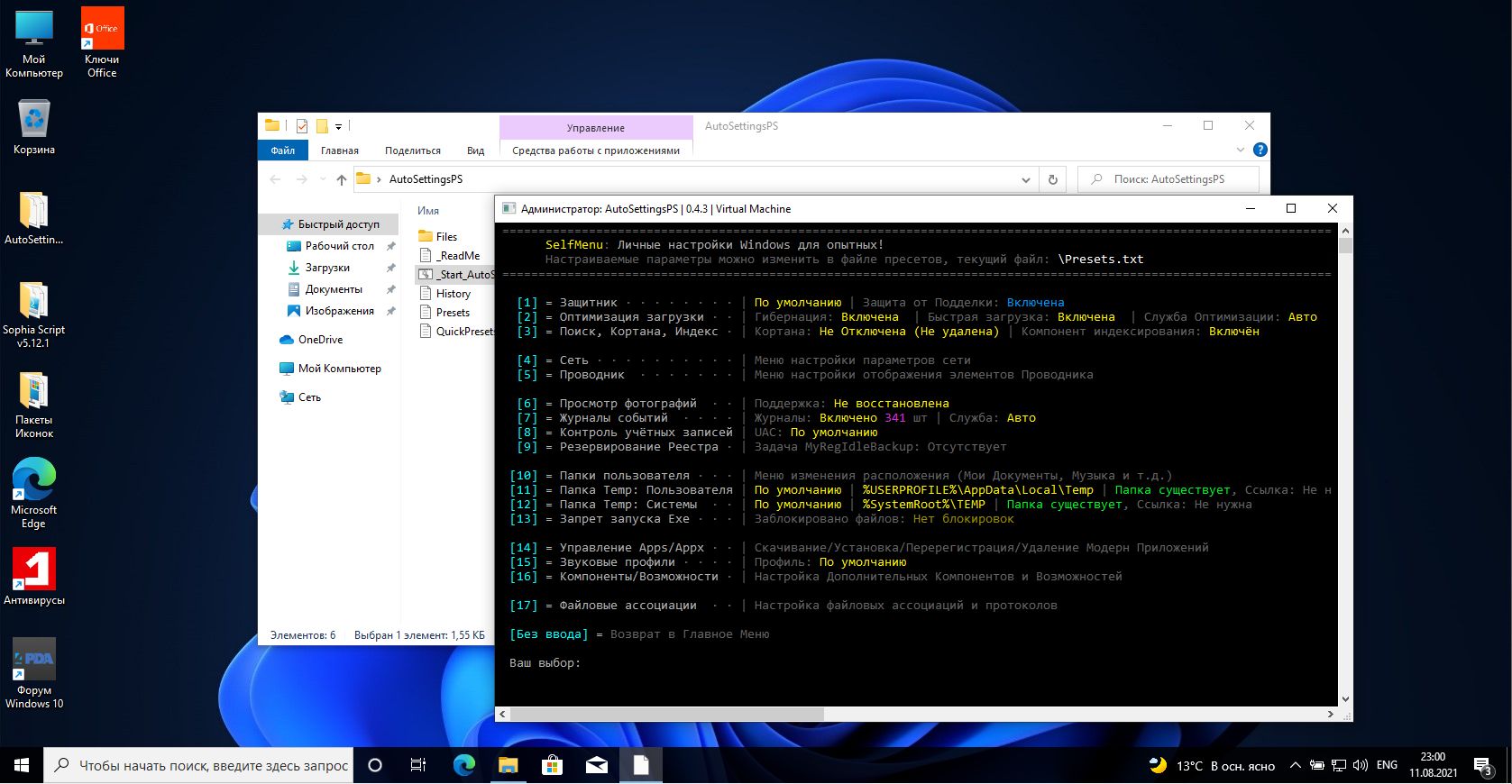 - Работает из папки с инструкциями по автоматическому настройке системных параметров и скриптовами для отключения некоторых функций