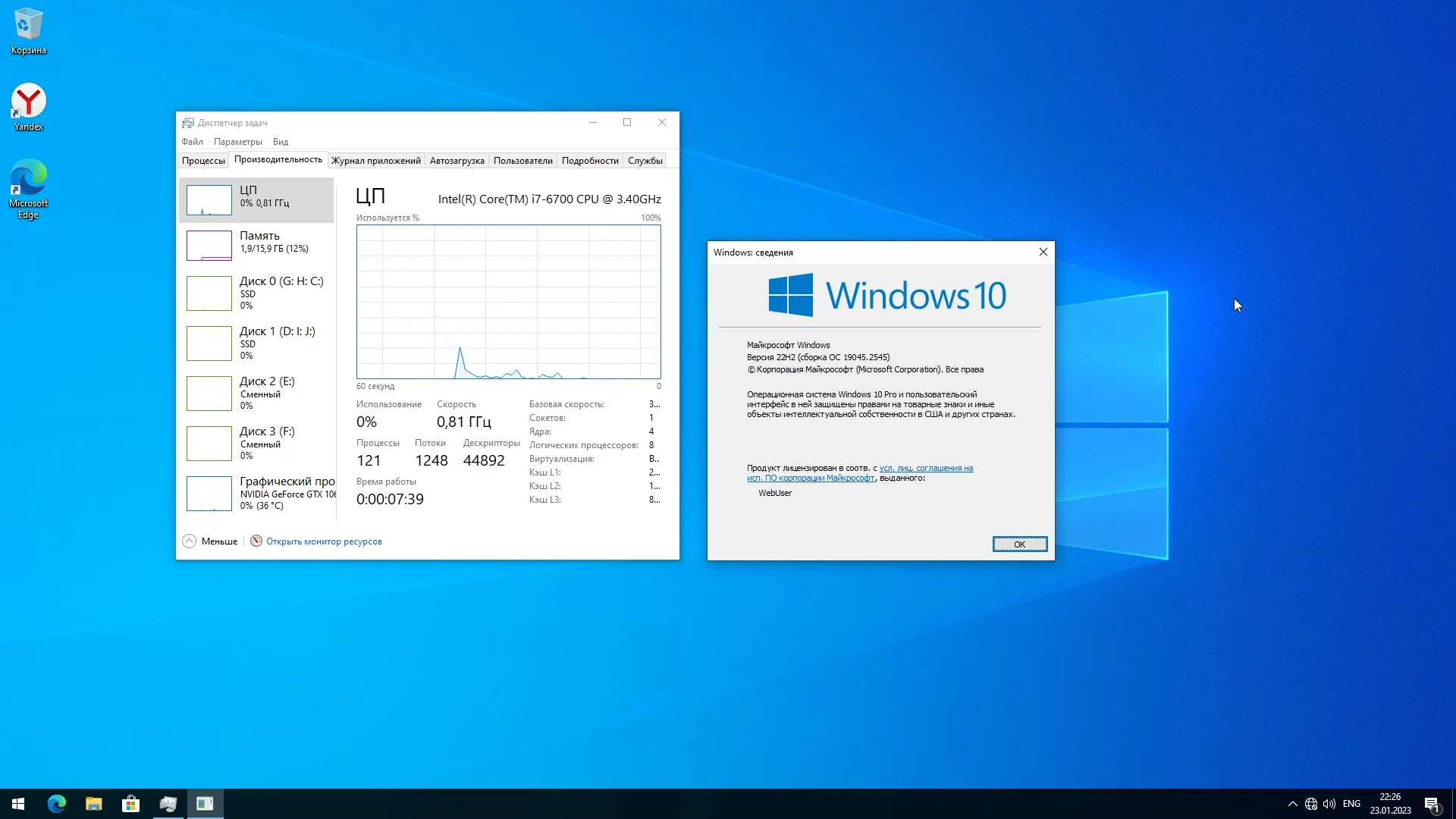Windows 10 22H2, сборка 19045.2545 без Защитника, включена операция бездействия с сервисами, удаленные приложения и отключения основных служб.
