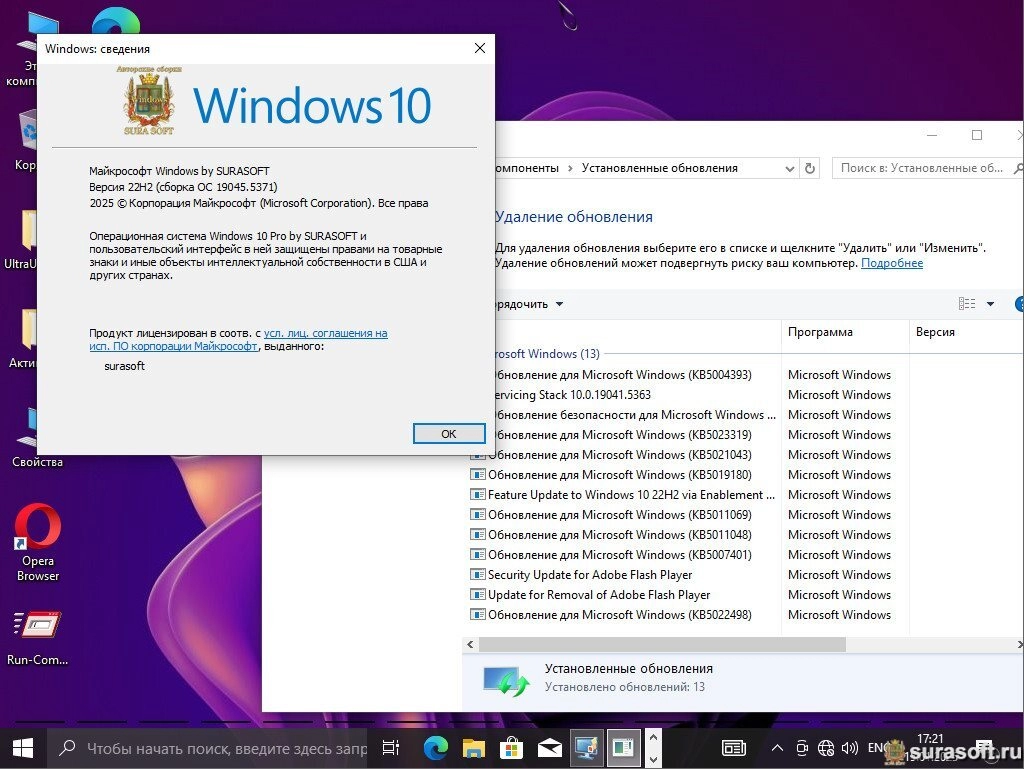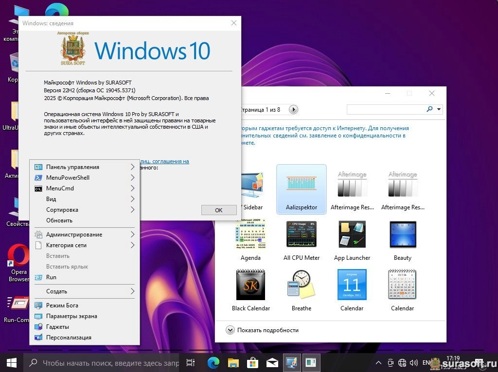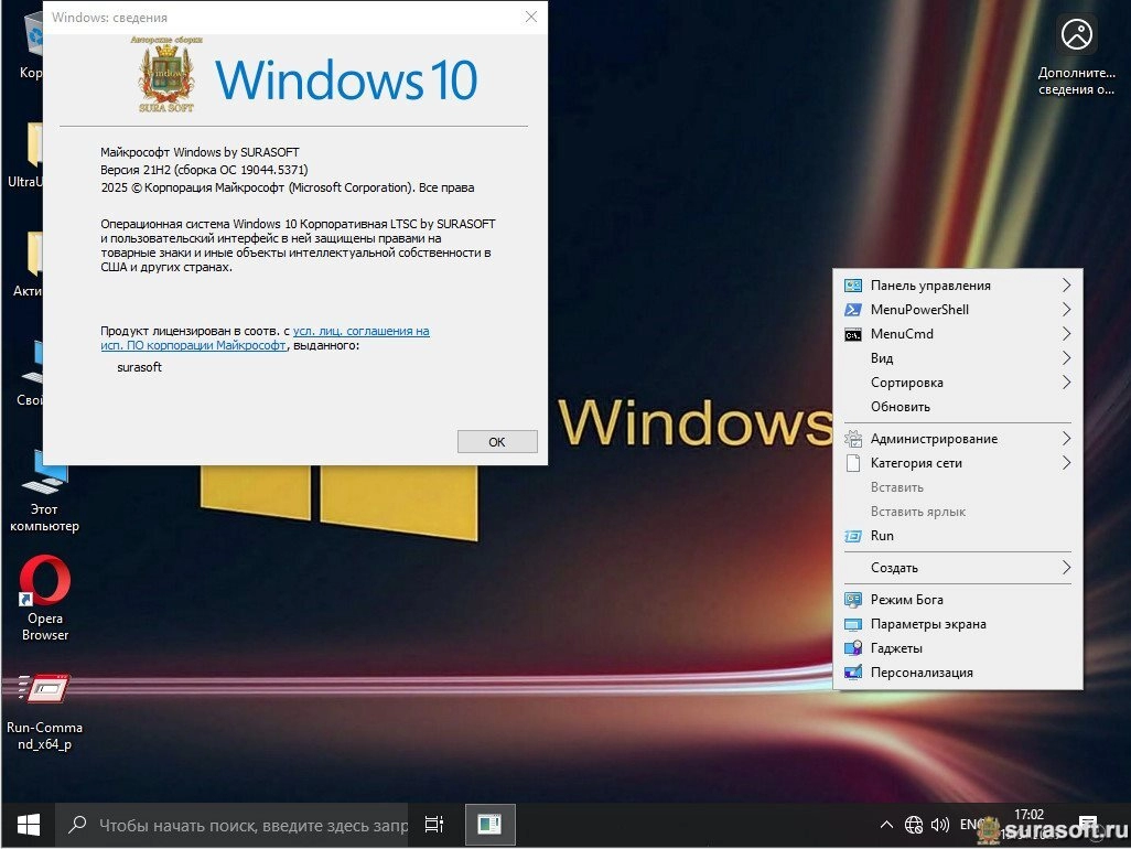 Windows 10 22H2 Build 19044_19045.5371 (by Surasoft) поставляется с обновлениями до января 2025 года, панель управления в контекстном меню, косметические изменения, Z-Zip, WinRAR, Opera, Yandex, StartBack, .Net Framework 4.8.1 и SmartFix 2.4.8. Microsoft DaRT в winre.wim и boot.wim, Visual C++ 2005-2022 (Update 3), DirectX 9c, Games Pack (Microsoft Collection) и SmartFix 2.4.8, Microsoft DaRT в winre.wim и boot.wim. Сборка создана на основе оригинальных образов MSDN с системами не подвергнутыми аудитом и при установке необходимо выполнить перезагрузку.
