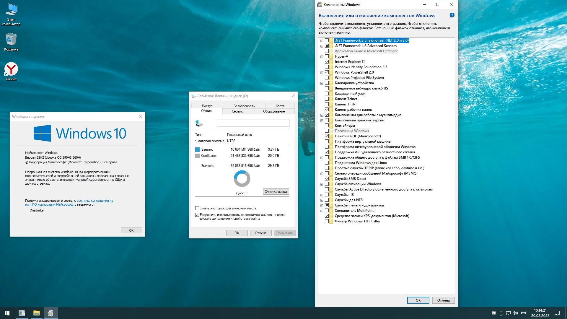 Windows 10 22H2, версия 22H2, построена на основе оригинального образа Windows 10 Business Edition v22H2 (ru-ru_windows_10_business_editions_version_22h2_updated_jan_2023_x64_dvd_742997d8). Это сборка не содержит модерн приложений и удалена телеметрия. Установлены 4 образа системы: Windows 10 Home, Windows 10 Pro, Windows 10 IoT Enterprise, Windows 10 Enteprise LTSC.