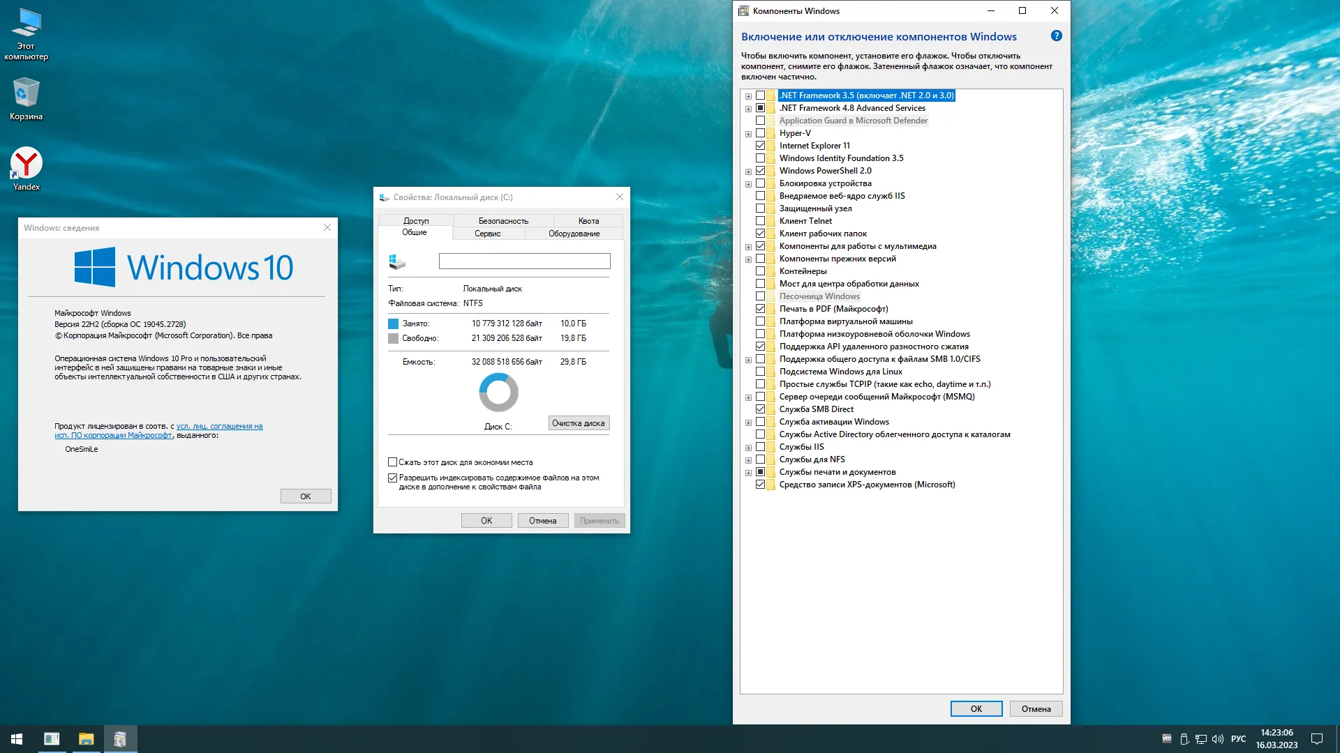 Windows 10 22H2 x64 Rus от OneSmiLe. Использование образа ru-ru_windows_10_business_editions_version_22h2_updated_feb_2023_x64_dvd_4ccde0ea ведет к удалению модерна приложений и 4 образов системы: Home, Pro, IoT, Enterprise LTSC. Включены: Defender выключен, WSearch, SysMain, ReadyBoot отключены; мусор убран из контекстного меню и телеметрия отключена. Объем жесткого диска требуется 10 ГБ для 64-разрядных систем.