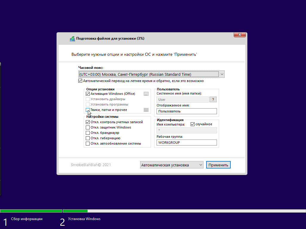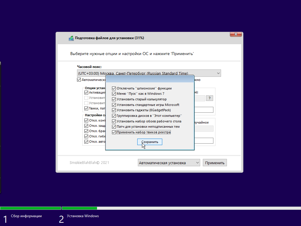 Галочка "Применить набор твиков реестра":