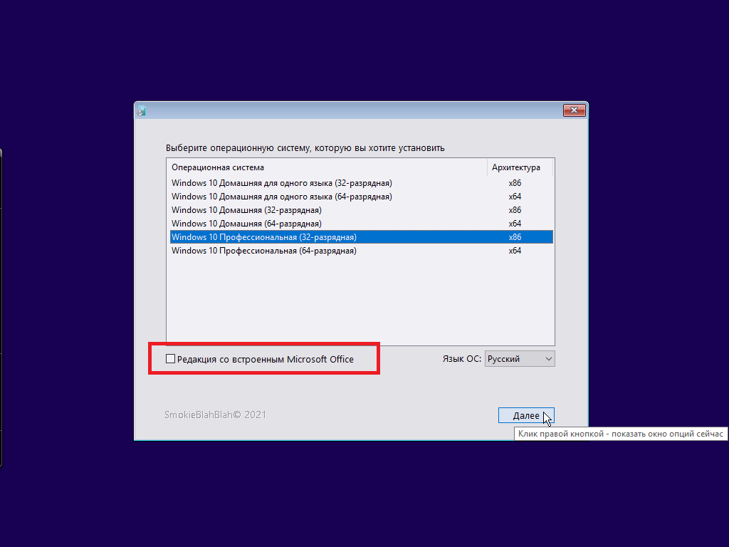+8 таких же редакций со встроенным MS Office 2019 Pro Plus x86 (можно выбрать, ставить ли Office. Галочка перед началом установки.) Язык офиса зависит от выбранного языка ОС. Начиная с версии 08.01.21 файлы Office вынесены в отдельный образ office.esd, который легко удалить из сборки.