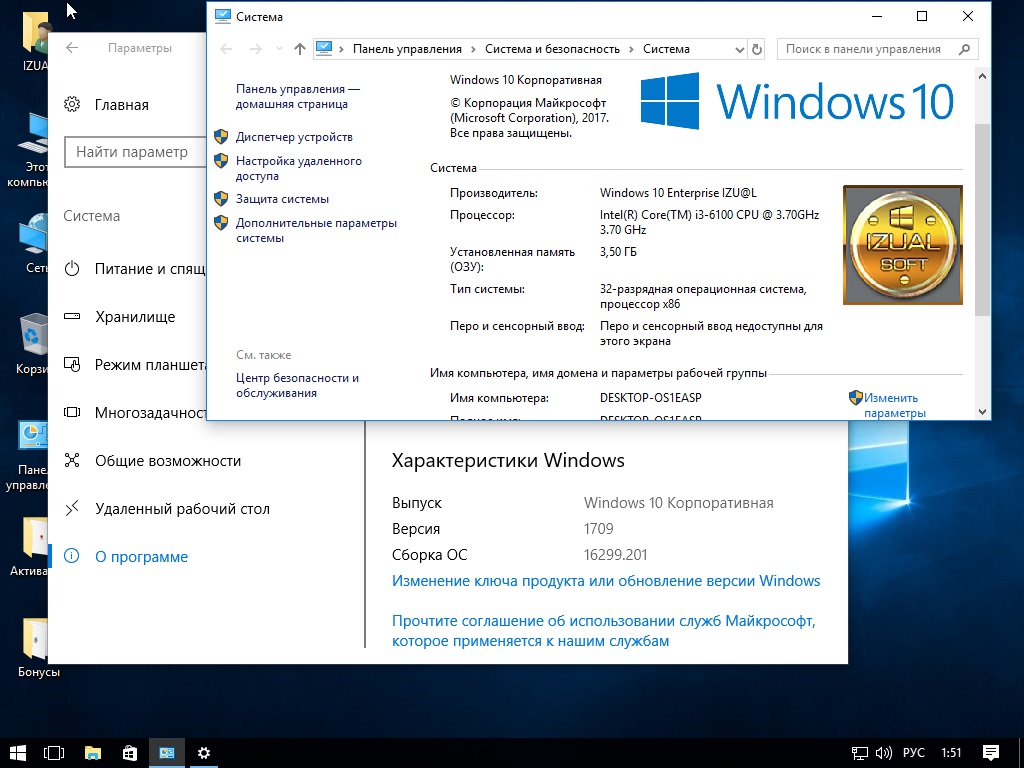 Скриншоты Windows 10 Enterprise 1709 build 16299.201 by IZUAL v.23.01.18 х32 торрент: