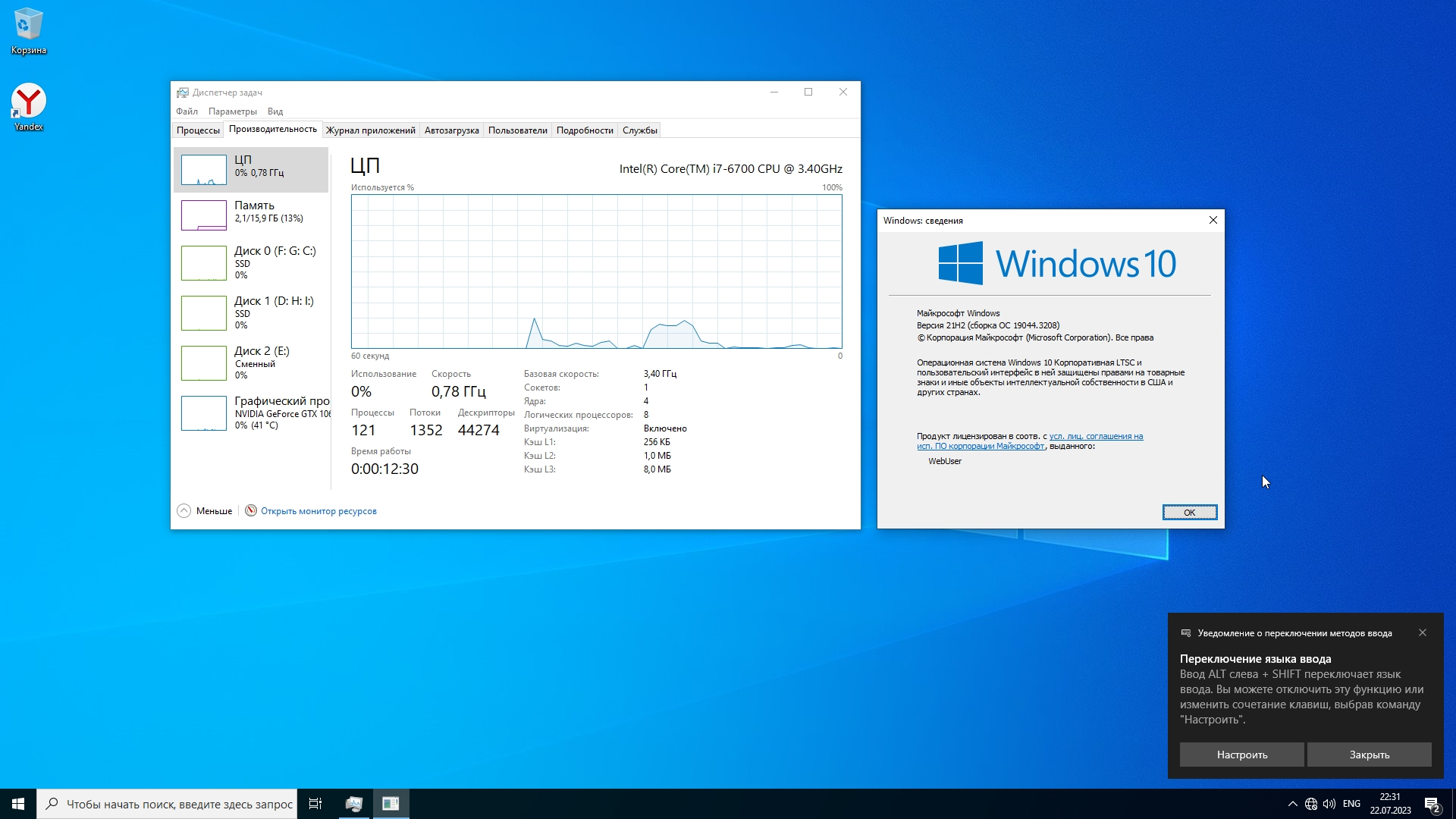Windows 10 Enterprise 2021 LTSC x64 July 2023 Системные требования: Процессор: Процессор с частотой 1 ГГц или более; система на кристалле SoC. ОЗУ: 2 ГБ для 64-разрядных систем, не требуется Место на жестком диске: 32 ГБ для 64-разрядных систем