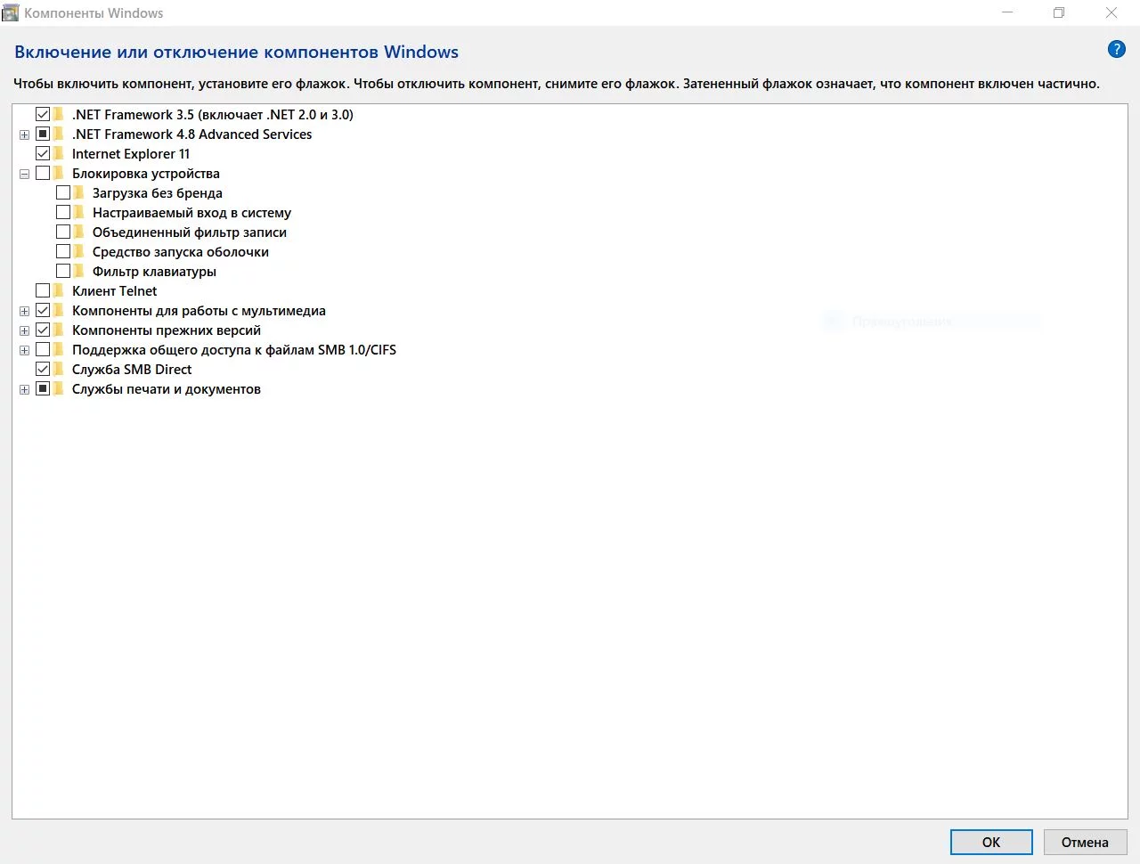 * Включено Direct Play, но не установлены Microsoft-Windows-PeerDist, Microsoft.Windows.PeopleExperienceHost, Microsoft-Windows-Printing-XPSServices, Microsoft-Windows-RemoteFX, Microsoft-Windows-Printing-PrintToPDF.