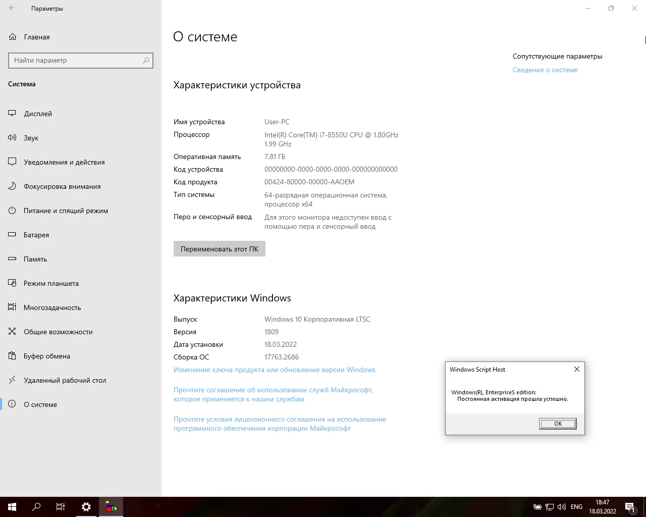 Система сконфигурирована так, чтобы установка прошла без лишних вопросов инсталятора. Сетевое имя присваивается User-PC.