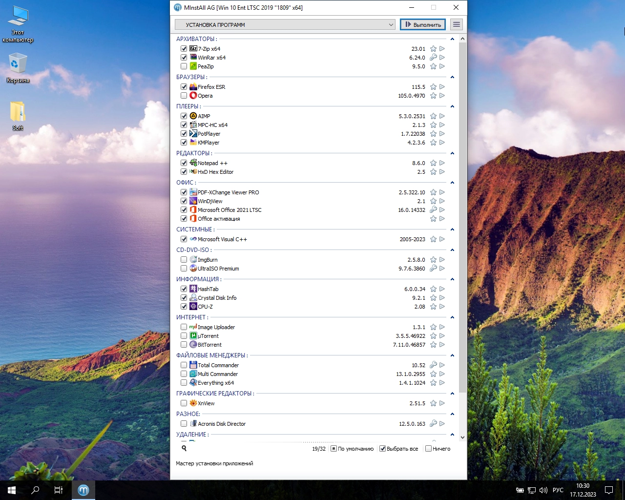 Программы и инструменты, необходимые для работы системы, устанавливаются автоматически с помощью оболочки MInstall после установки ОС. В составе оболочки МИнсталЛасти: WinRAR v6.24, 7-ZIP v23.01, PeaZip v9.5, Opera v105.0,