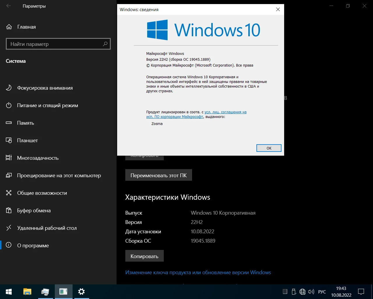 Windows 10 Enterprise x64 micro 22H2 build 19045.1889 by Zosma торрент, изменения: